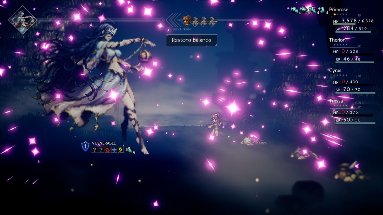 Yes, I would specifically cast the "protect your character from being hit by debuffs" ability, only to have Restore Balance wipe out Celestial Intervention anyway. That was... really unfair, what the heck! Thus Primrose effectively had to face this battle with no Starsong defenses at all, since any attempt to put her protective buff in place would get wiped out without me being able to do anything about it.