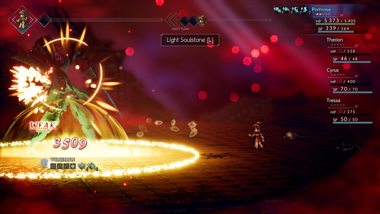 I tried my best by replaying this boss fight over and over again even though the odds seemed overwhelming. Eventually I figured out that Steorra's initial few shield weakness patterns weren't particularly favorable for Primrose. It was Steorra's fourth and final set of weaknesses that looked the most promising, with both dagger and wind elements to target. Therefore I tried to set up the final and most dangerous portion of this battle to correspond with this set of weaknesses. I would slowly break Steorra's initial 7 shields with Thunder Soulstones, then break 11 out of the next 12 shields with Fire and Ice Soulstones, leaving Steorra with one shield remaining. At this point, I would start casting Shooting Stars and knock Steorra down into the red health zone where she would use Ethereal Healing. Then I would break the final shield, hit her with a max boosted Shooting Stars, and continue frantically casting Shooting Stars as much as possible into that wind element weakness while using Refreshing/Revitalizing Jams whenever Primrose wasn't attacking.