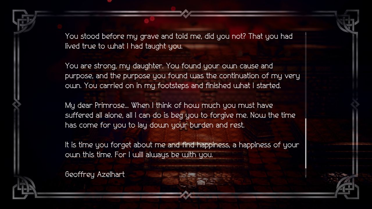 Now I really didn't want to mess up the remaining seven bosses; I wanted to get this right the first time so I could avoid ever seeing Darius again. I fought Werner next and once again found him to be quite easy. Repeatedly casting Starsong over and over again kept Primrose's evasion boosted and blocked Werner from being able to apply his Oppression debuff. With that protection in place, Werner really couldn't do much of anything even when he was getting three actions per round. It was a similar story against Simeon, where I took the time to use soulstones to unlock all of his shield weaknesses before knocking Simeon into his more dangerous AI routine. Starsong countered Simeon's Shredded Fortunes debuff and Primrose's evasion was too high for his Act of Impulse attacks to hit more than once in a blue moon. I wore down Simeon and defeated him without difficulty.