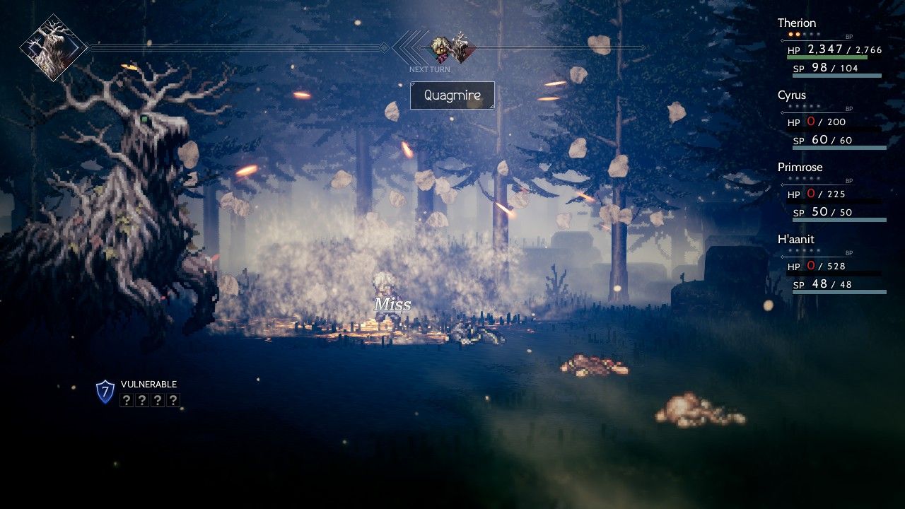 Ah, status ailments. If there was one thing that could stop Therion from lifestealing endlessly against the monsters, it was the silence status that blocked all use of skills. (I was reminded here of the skeletons in Diablo 2 that lifesteal didn't work against, otherwise weak foes that could cause serious problems for leech-dependent builds.) This picture was taken in the forests heading north towards Victor's Hollow and I found that these woodland creatures commonly used various silencing attacks in other parts of the game as well. While silence was the worst status ailment for Therion, darkness/blindness status was nearly as bad. HP Thief and Steal SP did not automatically hit the target, and if they happened to miss, then Therion wouldn't gain back any HP/SP in the process. (This was a real contrast to Runelord Tressa's experience, as she could buff herself up with runes on the first turn and not worry about being silenced afterwards, and similarly not care about being blinded since her elemental pursuits would always auto-hit the target.) For that matter, some of the owl monsters in these woods liked to cast a physical attack debuff on Therion, and that was pretty bad as well! If he was doing less damage with each hit, he would regain fewer HP/SP at the same time.