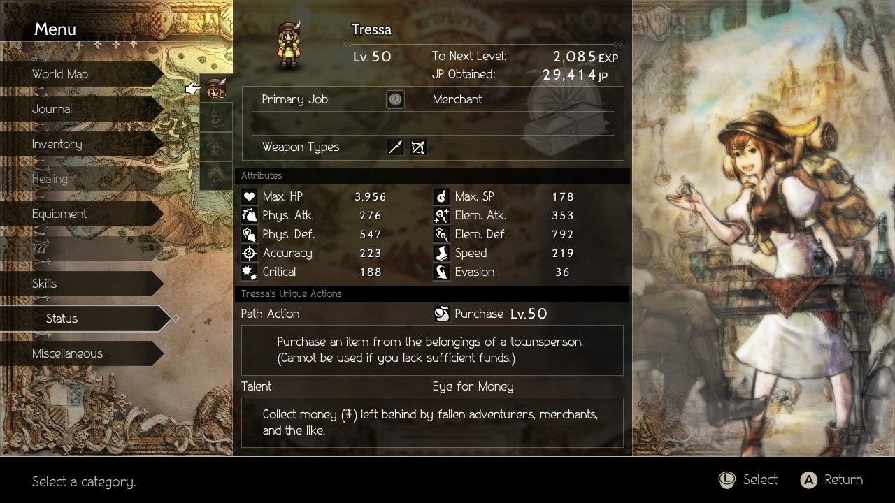 Tressa hit Level 50 shortly after finishing the Lizardmen's Den and I thought this would be a useful time to show her character screen again. She was sitting right around a healthy 4000 HP, although keep in mind that that number is boosted by the Empowering Necklace's +1000 HP that Tressa had been wearing for a long time. The SP total was similarly boosted by the Robe of the Flame armor, and thanks to SP Saver and Rest, running out of SP was never something that Tressa had to worry about. The status screen somewhat bizarrely does not include the bonus from weapons in the physical and elemental attack categories, so add about 280 to physical attack and 350 to elemental attack to get the actual numbers from Tressa's Forbidden Bow and Rune Glaive equipment. By contrast, the status screen DOES include the bonus from armor and accessories which is why the numbers are so much greater on the defensive side. I had been using the Robe of the Flame for a long time to buff up the power of Rest with its massive elemental defense, and that explains why the physical defense stat was so much lower. The remaining stats (accuracy, speed, critical, and evasion) don't seem to matter nearly as much as physical/elemental attack and defense as far as I can tell. Tressa never seemed to miss her attacks and no one ever seemed to miss her so I'm not sure what role accuracy and evasion play in this game. Speed is similarly much less important in a turn-based combat system as opposed to the active time battle of the classic Final Fantasies. Finally, having a higher crit chance was obviously good to get off more crits, but no one seems to have a breakdown of how this stat functions and crits only deal +25% more damage anyway. They just aren't as important in this game as compared to crits in many others.