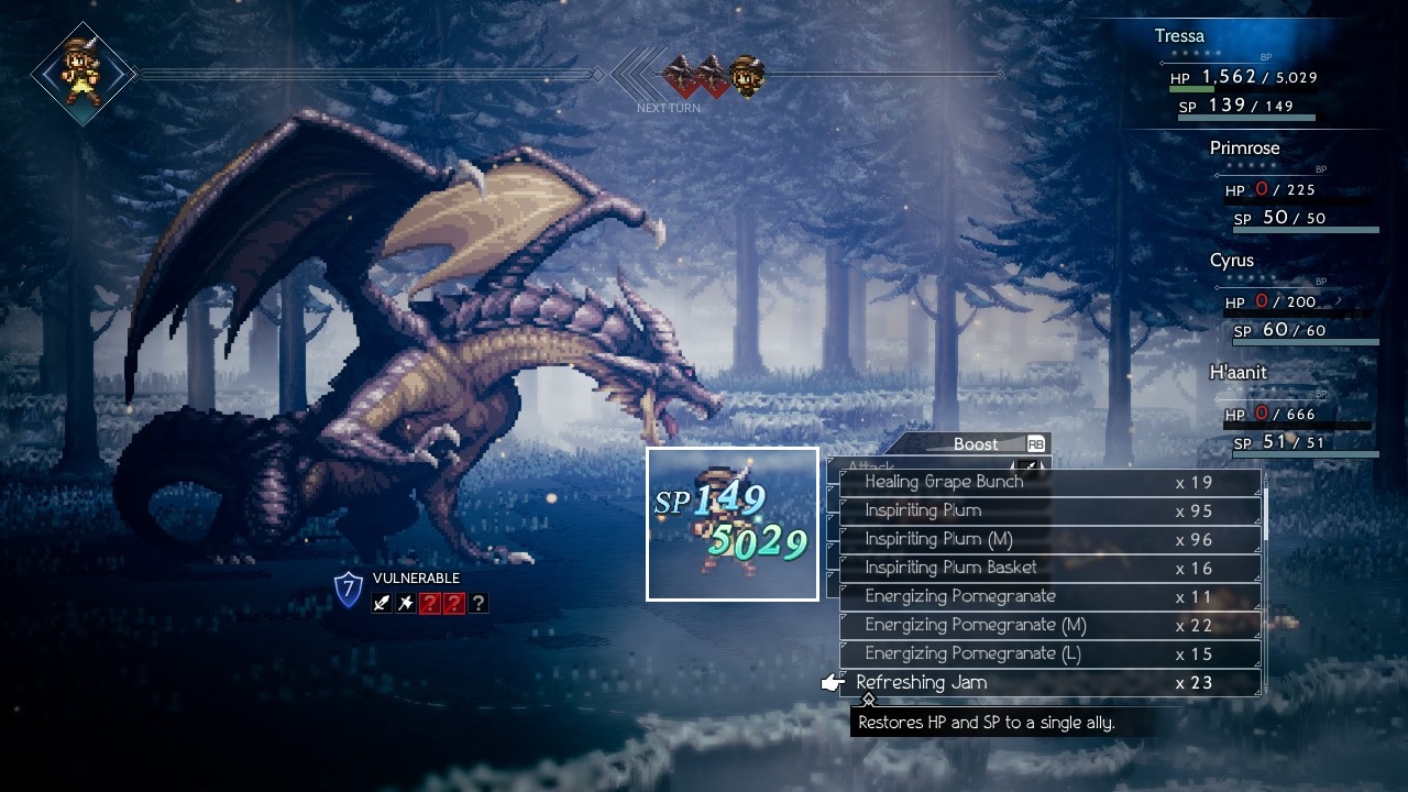 Without Swept Away to concern me, I only needed to focus on having Tressa defeat the Dragon itself. The most dangerous attack proved to be the appropriately-named "Dragonfire", a heavy fire elemental attack that was well in excess of 1000 damage at a time. It was painful enough that Tressa needed to break out a Refreshing Jam at one point, Octopath Traveler's version of an Elixir that fully restores HP and SP to maximum. From there Tressa was able to keep using Mercenaries for breaking purposes/physical defense buffing into Veteran Soldiers for damage, and that proved to be sufficient to win out. Looking back at this battle, there was definite room for improvement on my part. I had overloaded Tressa with physical defense gear and that was part of the reason why the Dragonfires were hitting so hard. Better yet would have been equipping an accessory that reduced fire element damage, something that I'll keep in mind for the future. Most of the danger in this fight can be removed by nullifying that fire damage.