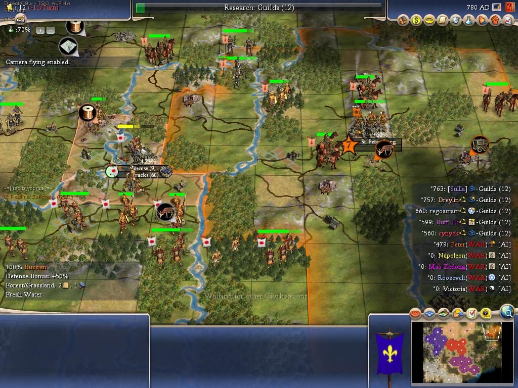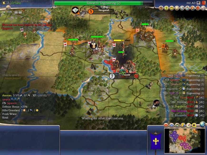 Moscow was the last AI capital still holding out, and Peter seems to have stacked most of his defenders there. It was a definite keeper, with Parthenon, Chichen Itza, and Sistine Chapel inside. Cynyck gifted the city to Dreylin, which allowed him to pass me in score! This kind of effrontery will not stand!