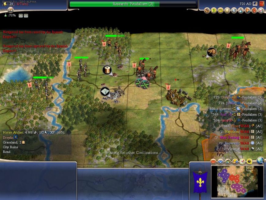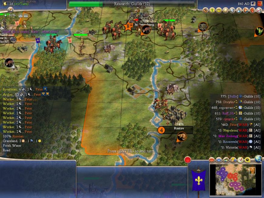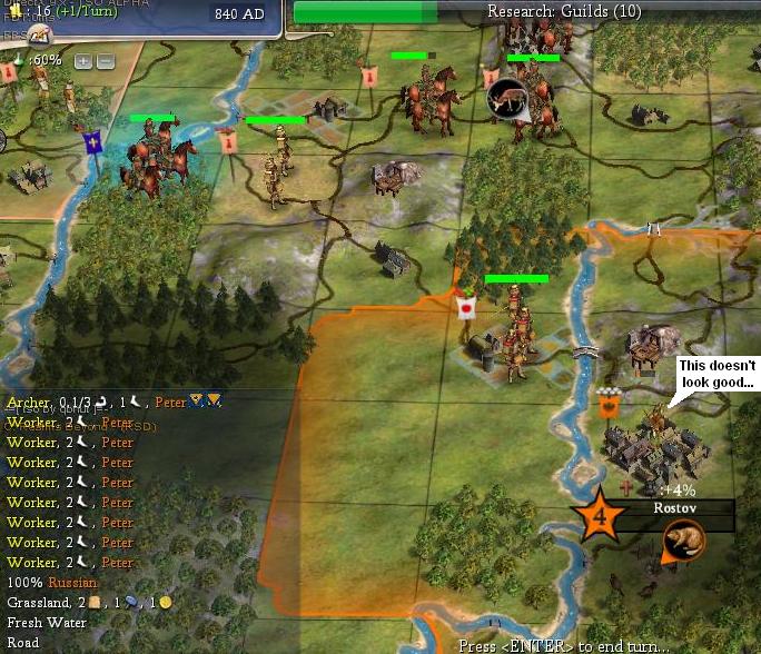 Umm... why does this Russian core city have only two archers on defense? Answer: two spears have moved out of the city, guarding a settler - moving right into the teeth of Dreylin's army!