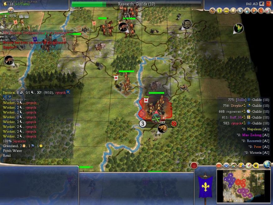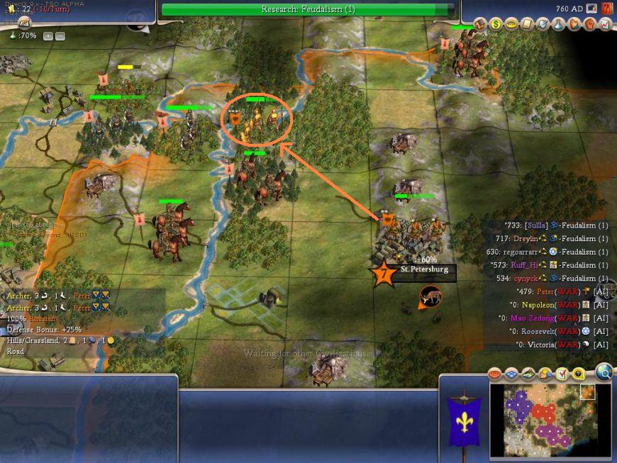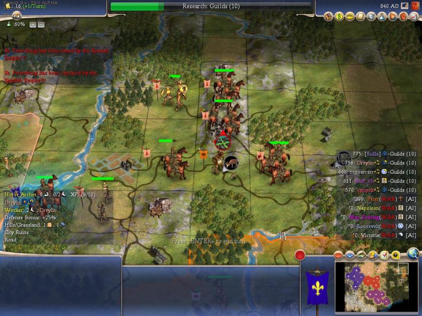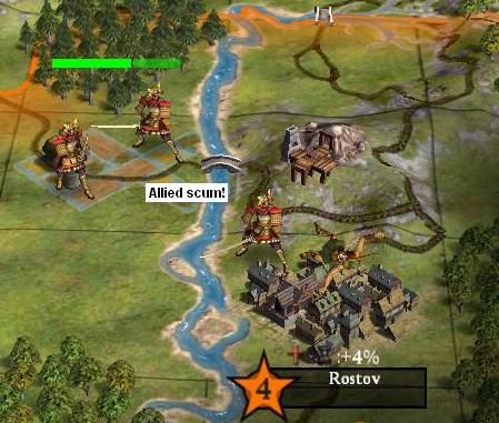It's hard to see in this picture, but St. Petersburg and Rostov are both under simultaneous assault. Cynyck's samurai are in mid-animation in the south, while Dreylin's horse archers are exchanging shots with the archers in Rostov. (By the way, what's up with all those workers in Rostov?!) As it turned out, St. Petersburg was the first to fall: