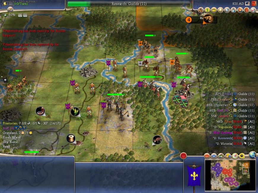 I guess all that open land on this Large Great Plains map was a temptation the AIs couldn't resist. (This is something I plan to keep in mind for future MP events, since the AI didn't handle it well here.) In any case, flashing that settler pair right next to Ruff's huge Praetorian/cat stack was certainly less than wise.
