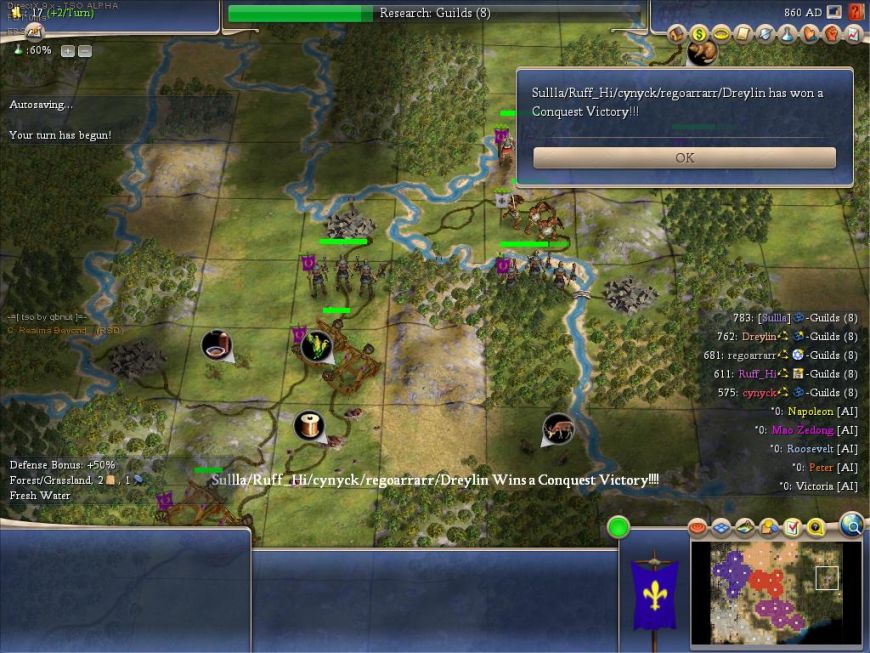 The last Allied civ fell in 840AD. And when we clicked through to the next turn, we won a Conquest victory in 860: