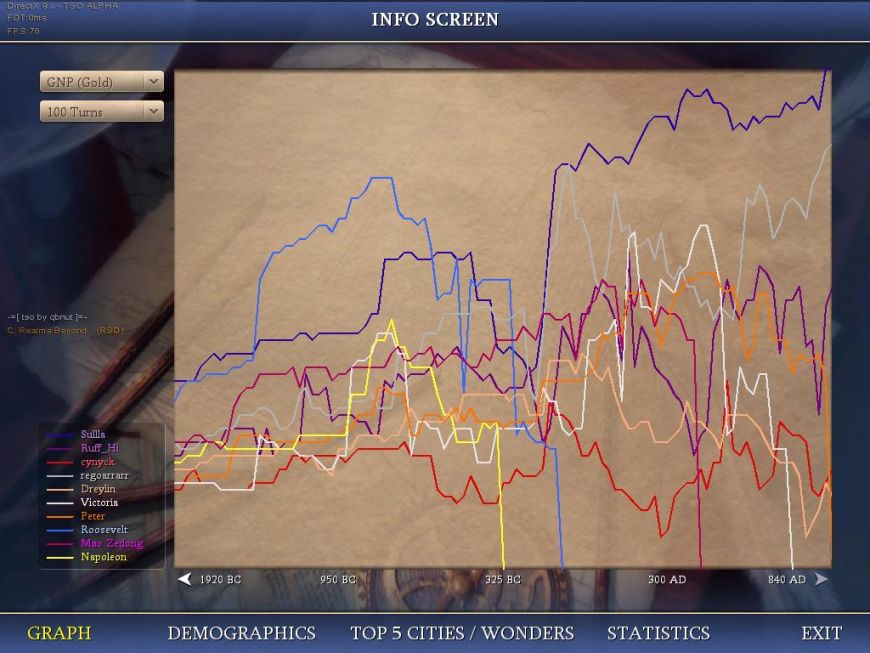 The GNP bars, where you can finally see my contributions! I also generated all of our Great People in this game, so I hope that they were well used. Regoarrarr and all of his floodplains cottages were really starting to mature at the end of the game and kick in some serious income too. Dreylin and cyncyck were in competition for the Epic Five bankruptcy award.
