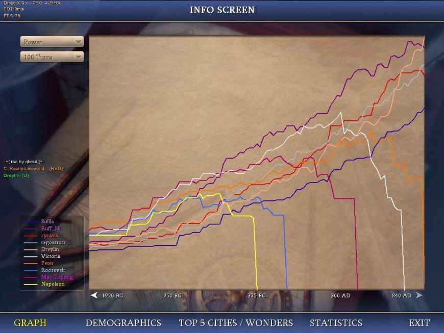 You can also see where my economy nose-dived around 500BC when the barbs were pillaging me, and the huge initial charge out in front produced by Roosevelt's floodplains cottages + early Bureaucracy. It's a good thing that he was swarmed by Praetorians before he could put that commerce into some better military technology!