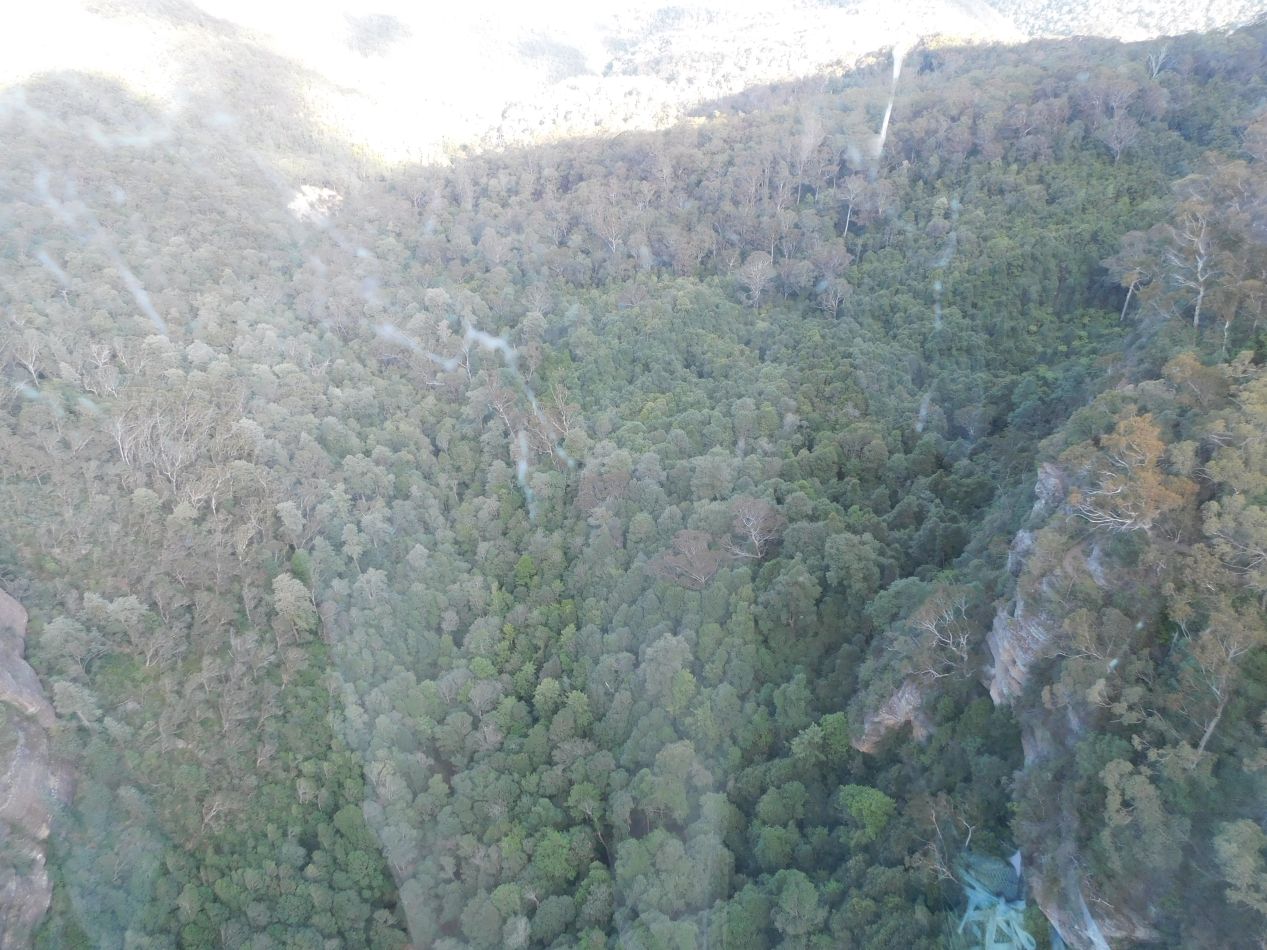 The ride on the Scenic Skyway proved to be a short one, lasting roughly three minutes to reach the cliffs on the other side. Scenic World has to keep the cable car moving along at a brisk pace because there's only one gondola which has to be loaded and unloaded for every single trip. (I'm a little surprised that they don't have two cable cars for the summer months, one able to move in each direction simultaneously.) Even though the ride was brief, we did manage to enjoy some impressive sights along the way. The best of these involved looking directly down through the glass floor, providing a perspective that we wouldn't be able to see otherwise throughout the rest of the day. There was a thick forest down below that we planned to explore later. Near the far end of the gondola route, we passed close by Katoomba Falls as they plunged over the cliffs down to the forest floor. Aside from a bit of a glare from the afternoon sunlight off the glass of the cable car, these were some excellent views and very much worth seeing.