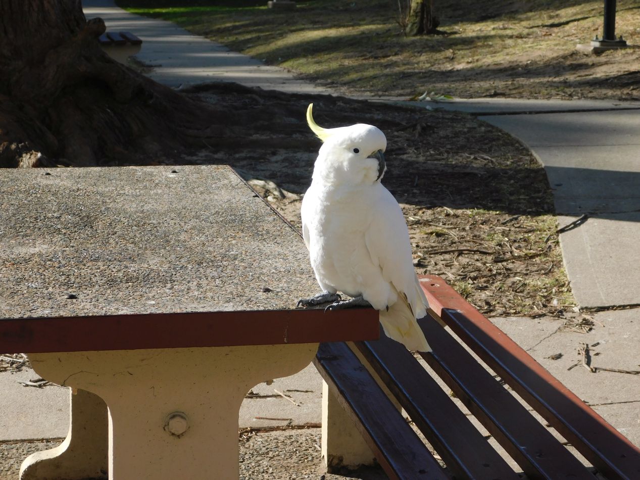 Now we were on the opposite side of the cliff face from Scenic World and had to figure out what to do next. We could either take the same Scenic Skyway back to the main entrance (what most of the passengers were choosing to do) or try walking back along some of the trails that ran through the area. This whole region was part of Blue Mountains National Park, and there were walking trails everywhere running both along the tops of the cliffs and down into the valley below. Scenic World was only about a mile's distance away around the rim of the cliffs so we decided that we'd try the walking path, hopefully running into some interesting stuff along the way. The first thing that we encountered was a group of cockatoos hanging out in a small public park. These birds didn't seem scared of humans in the slightest and I'm guessing that they regularly ran into people who fed them. Then we found ourselves crossing the waters of the Kedumba River shortly before it plunged over the cliffside as part of Katoomba Falls. This was the most popular part of the walking trail, with several different families investigating the waters with their kids.