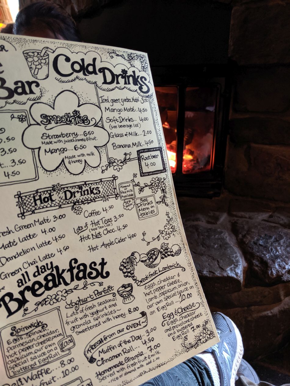 It was raining and cold when we arrived in Katoomba a little after noon, and we decided that the first thing to do was grab something warm to eat for lunch. We quickly settled on a cafe named the Yellow Deli, which had a setup designed to look like an old-fashioned country store, complete with a welcome fire burning in the fireplace. The Yellow Deli seemed to have a counterculture hippie feel to it, from the hand-drawn lettering on the menu decked out with flowers to the bearded and tie-dyed appearance of the cafe's staff. There were informational brochures that revealed the Yellow Deli was run by a collective that had settled in Katoomba a few decades earlier, a group that sounded suspiciously like a cult in the sense that everyone lived together and no one received money for the work that they did at the deli. But, uh, the food was excellent, no doubt about that! Liz had some chili and I ate some bread, with the picture above showing me doing my best starving orphan face at having a meal of bread alone. (That was by my own choice - I love fresh bread!)