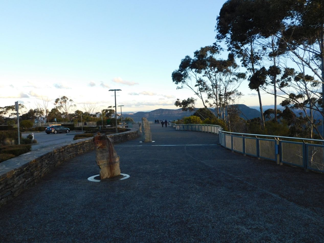 With Scenic World about to close for the day, we hopped back into our rental car and made the short drive over to Echo Point. This was close to where the Scenic Skyway had deposited us earlier in the day, and constituted a lookout point with the best views of the Three Sisters. The sun was just about to set behind the cliffs in the west, and we were enjoying watching how the fading light kept shifting as it passed behind different clouds and then emerged once again. This was a great place to take some last looks at Scenic World and the Skyway cable car as it made its final crossings of the day over the valley below.