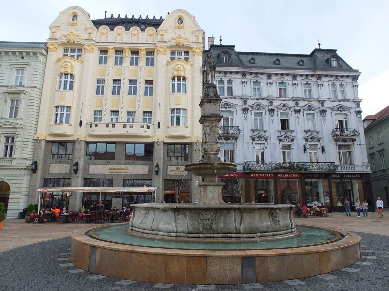 I continued walking around the Old Town part of Bratislava after lunch. These buildings had a surprisingly Mediterranean feel to them, and some of the plazas that I walked through gave me the impression of being in a scenic Italian town. Perhaps it was some of the colorful buildings that I came across, painted in pastel shades of yellow, green, and even pink in one particularly memorable case. Or maybe it was the churches; I came across several of them in these crowded streets, and caught the tail end of the Catholic services in one small church as it was finishing up. I wasn't searching for any destination in particular here, with many of the tourist attractions closed on a Sunday. There was a larger open area on the southern side of the Old Town, with a small public park surrounded by nice restaurants and formal buildings. This was the location of the Slovak National Theatre (Slovenské národné divadlo), pictured above with its elegant fountain in front. If I had wanted to get something fancy to eat, this would have been the area to visit.