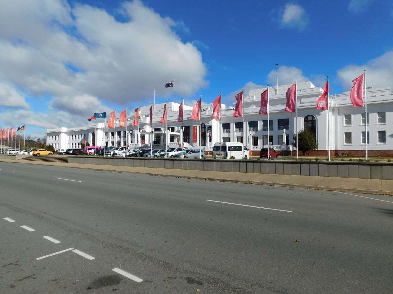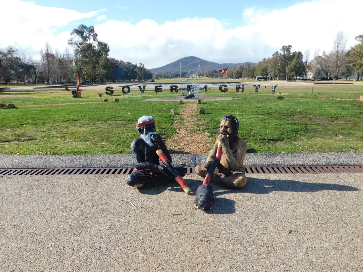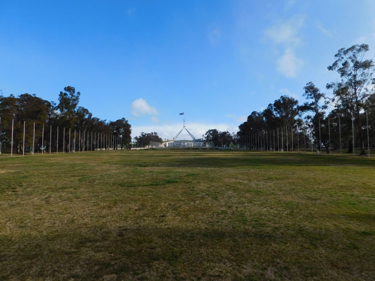 We reached Canberra slightly after noon and drove to the south side of the central lake, parking in a neighborhood near the main parliament building. After getting a quick lunch we walked around to the Old Parliament House, the white-colored building pictured above. The Old Parliament House was the first meeting place for the Australian Parliament in Canberra; it was in use from 1927 to 1988 when the current and much larger Parliament House was constructed. This structure was never intended to be permanent and it remained in use much longer than it probably should have been thanks to lengthy delays in selecting the site for the current parliament. We would end up being shocked at the tiny size of Old Parliament House and amazed that a continent-spanning country could have been run from such a humble place for long decades on end. There was an aboriginal protest taking place in the National Rose Garden out in front of the building, a common sight in Canberra; the red-and-black flag with the golden sun in the middle is the aboriginal flag, which was widely displayed across the city.