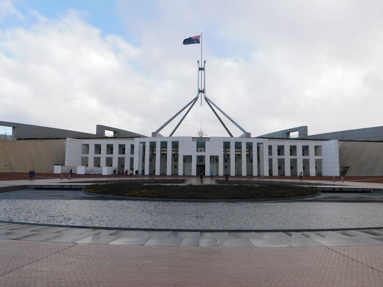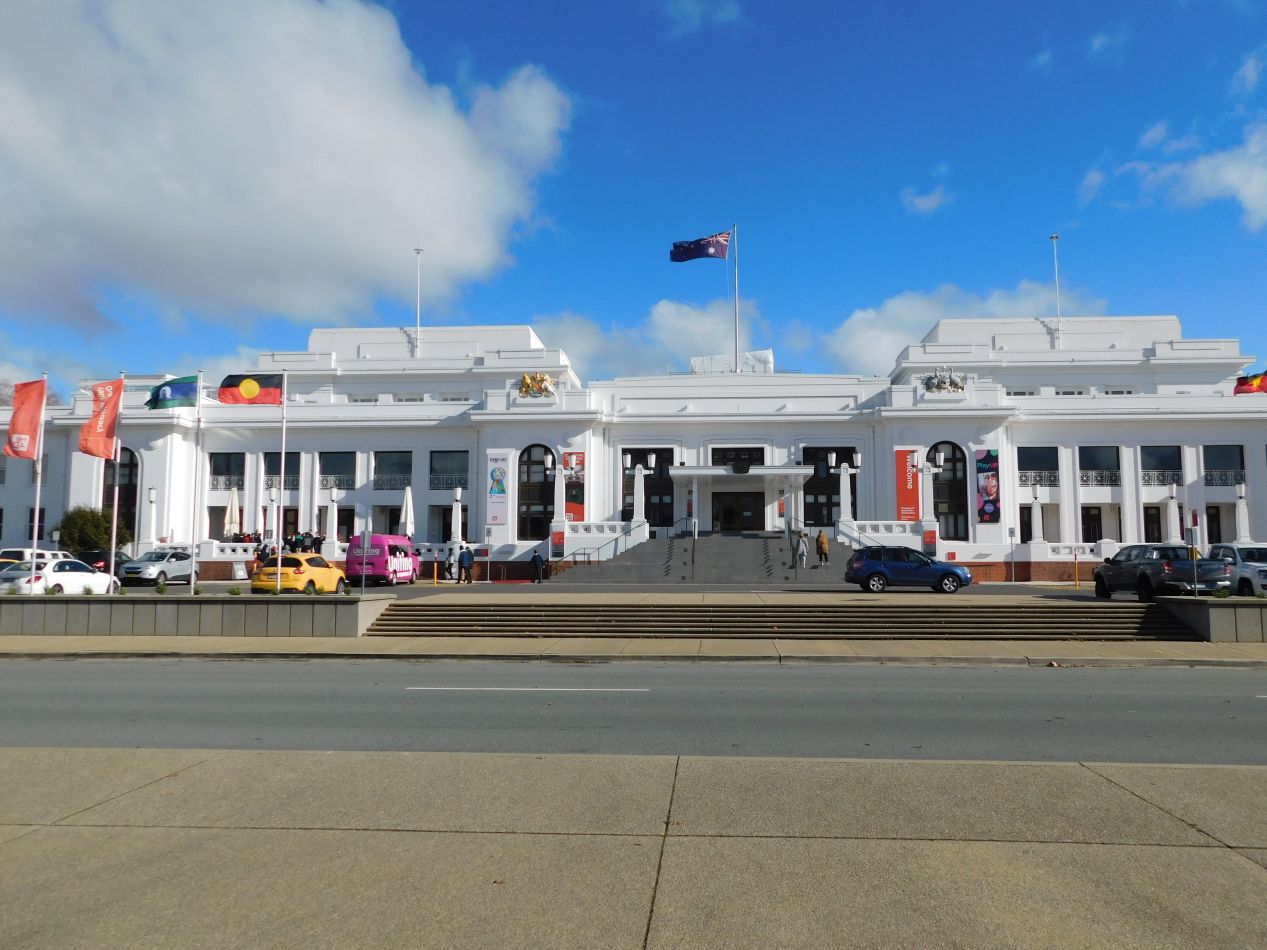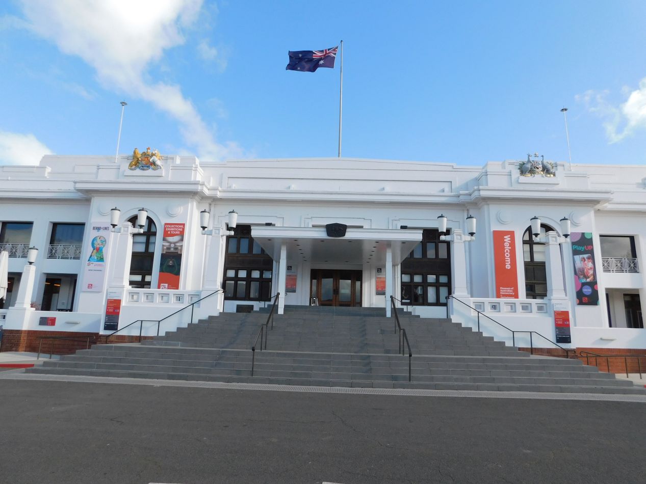 We reached Canberra slightly after noon and drove to the south side of the central lake, parking in a neighborhood near the main parliament building. After getting a quick lunch we walked around to the Old Parliament House, the white-colored building pictured above. The Old Parliament House was the first meeting place for the Australian Parliament in Canberra; it was in use from 1927 to 1988 when the current and much larger Parliament House was constructed. This structure was never intended to be permanent and it remained in use much longer than it probably should have been thanks to lengthy delays in selecting the site for the current parliament. We would end up being shocked at the tiny size of Old Parliament House and amazed that a continent-spanning country could have been run from such a humble place for long decades on end. There was an aboriginal protest taking place in the National Rose Garden out in front of the building, a common sight in Canberra; the red-and-black flag with the golden sun in the middle is the aboriginal flag, which was widely displayed across the city.