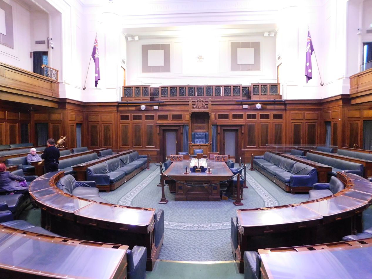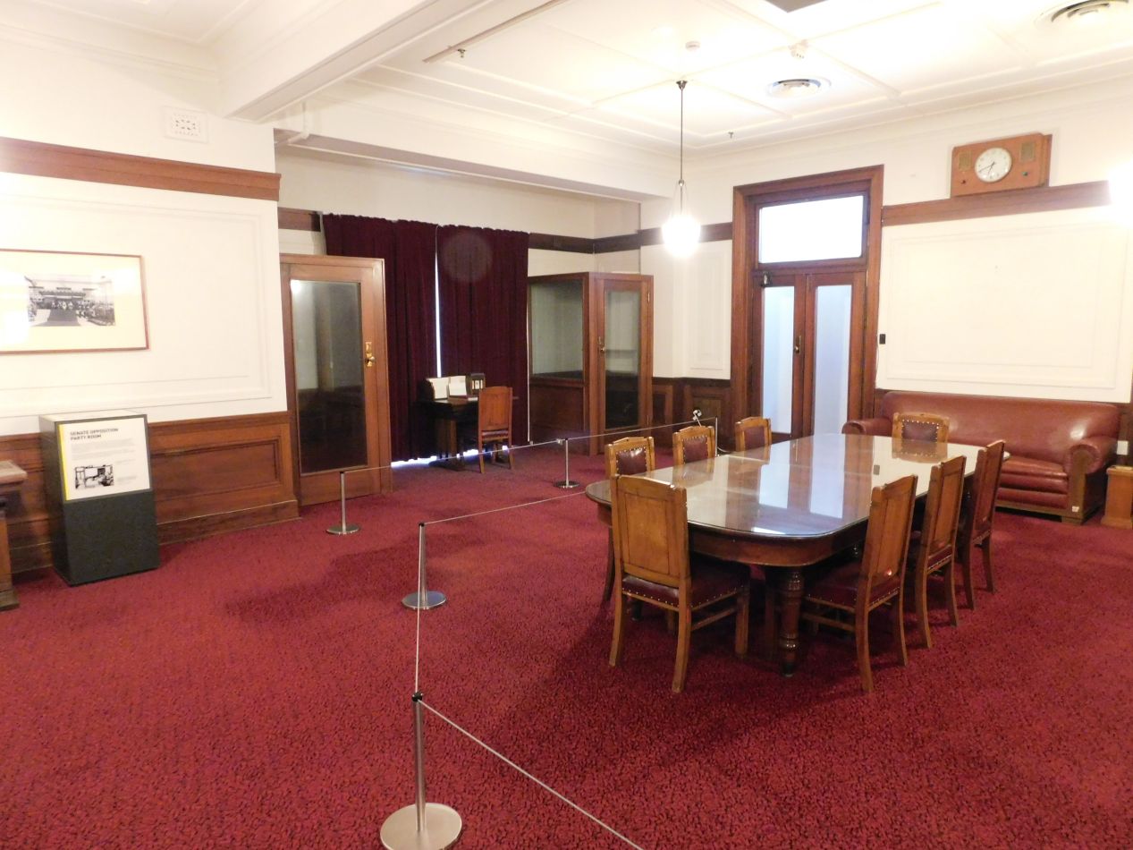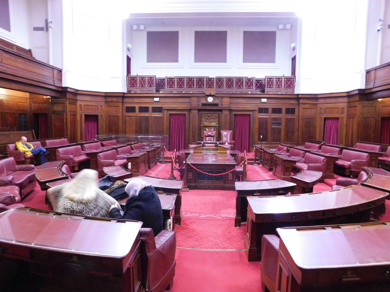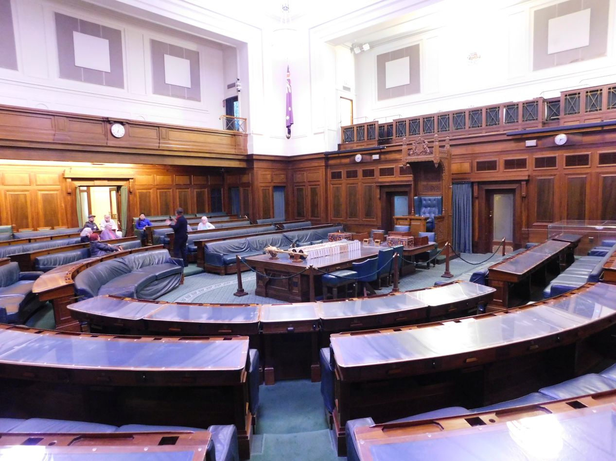 It was very easy to make our way inside the Old Parliament Building, with no lines present and no fees required. The staff was incredibly nice and asked if we wanted to take part in a tour, which we had to decline because we only had about an hour before we needed to head over to the New Parliament Building to catch a tour there. Instead we guided ourselves around the small building, first stopping here in the old House of Representatives. This was a somewhat cramped room with cushioned benches for the Australian MPs instead of individual chairs. That was something I'd never seen before in a parliament chamber, and I've visited a fair number of them. We were also able to see the ceremonial mace and the Speaker's Chair at the center of the room. There was a small tour already taking place in the room when we arrived, and the tour guide explained the unusual significance of that speaker's chair. It was based on a copy of the Speaker's Chair used in the House of Commons in Britain and presented to Australia in 1926, only for the Australian chair to be copied itself and sent back to London after the original was destroyed by bombing in World War II. Obviously the setup here was designed to replicate the British Parliament at Westminster, albeit on a much smaller scale.