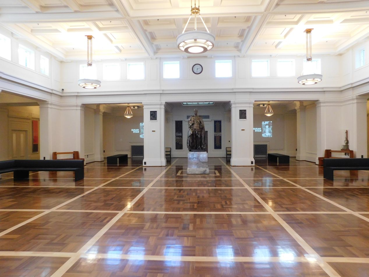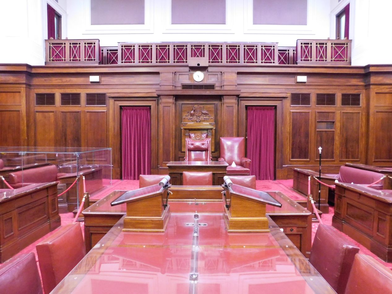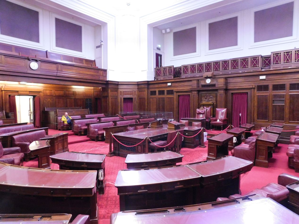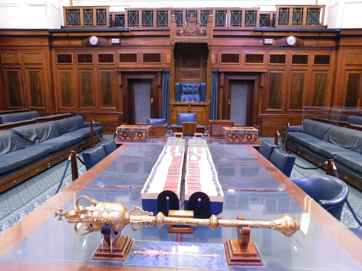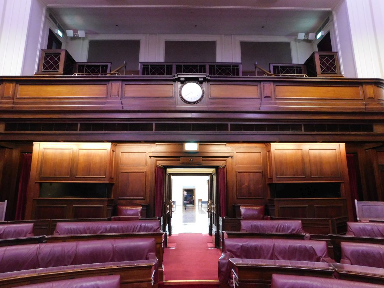 It was very easy to make our way inside the Old Parliament Building, with no lines present and no fees required. The staff was incredibly nice and asked if we wanted to take part in a tour, which we had to decline because we only had about an hour before we needed to head over to the New Parliament Building to catch a tour there. Instead we guided ourselves around the small building, first stopping here in the old House of Representatives. This was a somewhat cramped room with cushioned benches for the Australian MPs instead of individual chairs. That was something I'd never seen before in a parliament chamber, and I've visited a fair number of them. We were also able to see the ceremonial mace and the Speaker's Chair at the center of the room. There was a small tour already taking place in the room when we arrived, and the tour guide explained the unusual significance of that speaker's chair. It was based on a copy of the Speaker's Chair used in the House of Commons in Britain and presented to Australia in 1926, only for the Australian chair to be copied itself and sent back to London after the original was destroyed by bombing in World War II. Obviously the setup here was designed to replicate the British Parliament at Westminster, albeit on a much smaller scale.