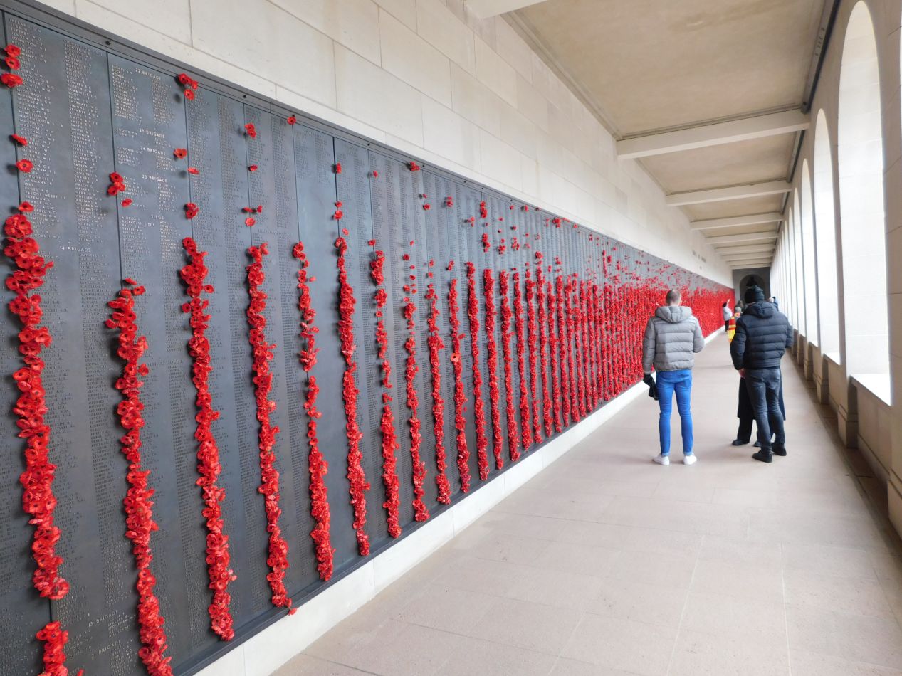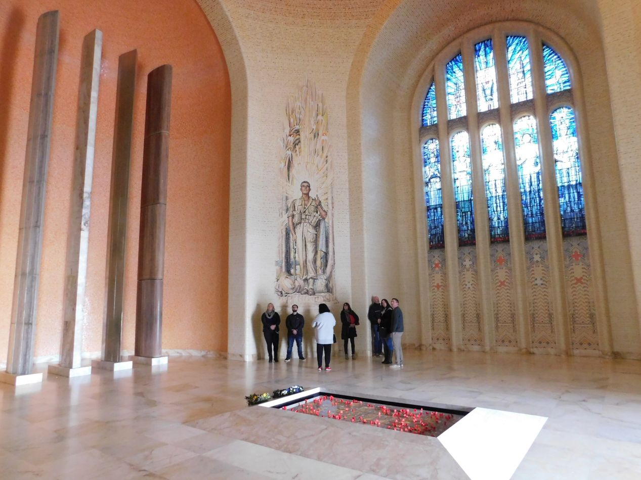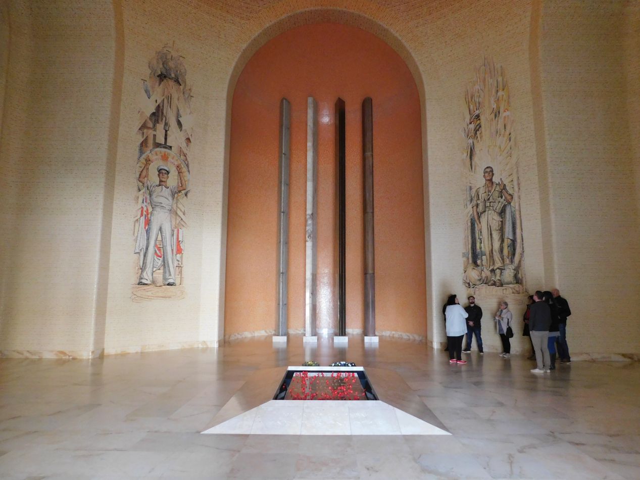 The center of the War Memorial holds the domed chamber known as the Hall of Memory, the oldest part of the building and the first to be completed in 1941. The entrance to this room is preceded by a narrow courtyard with a memorial pool surrounding an eternal flame, with two rows of arched columns flanking the pool on either side. These contain a series of bronze plaques naming more than 100,000 Australian servicemen and servicewomen killed in past conflicts or on peacekeeping operations. One of the two walls is entirely covered with the names of the 66,000 Australians who died in World War I while the other side holds the dead from World War II and more recent conflicts.