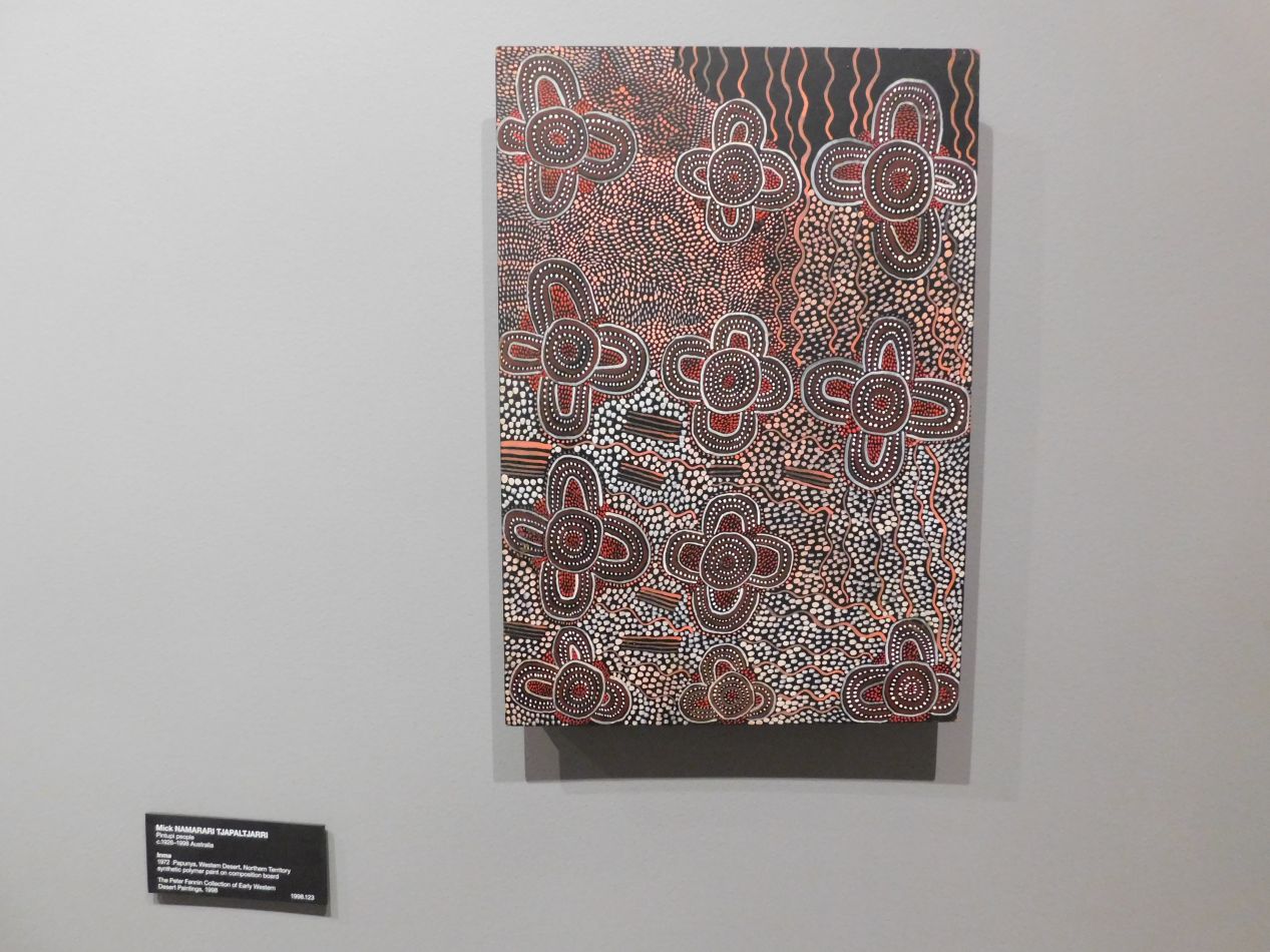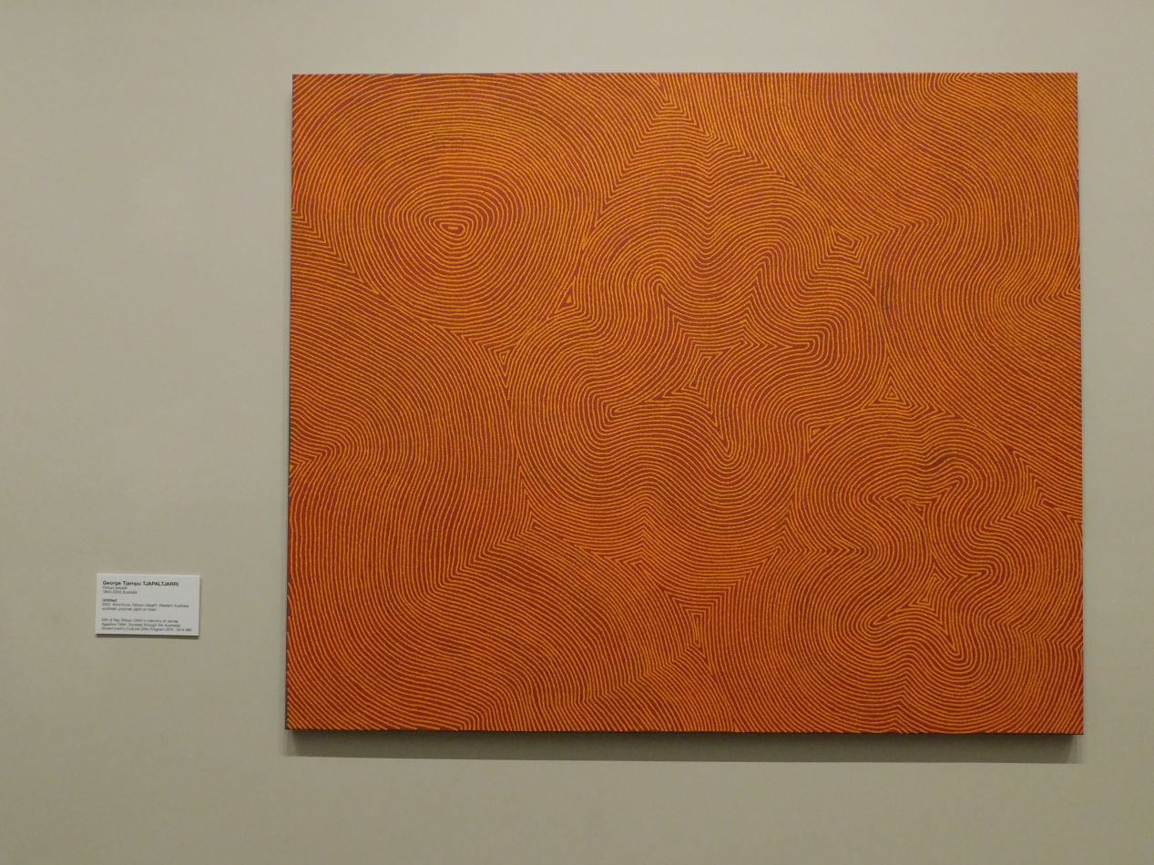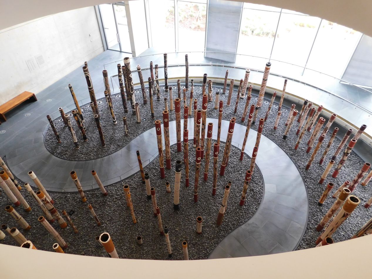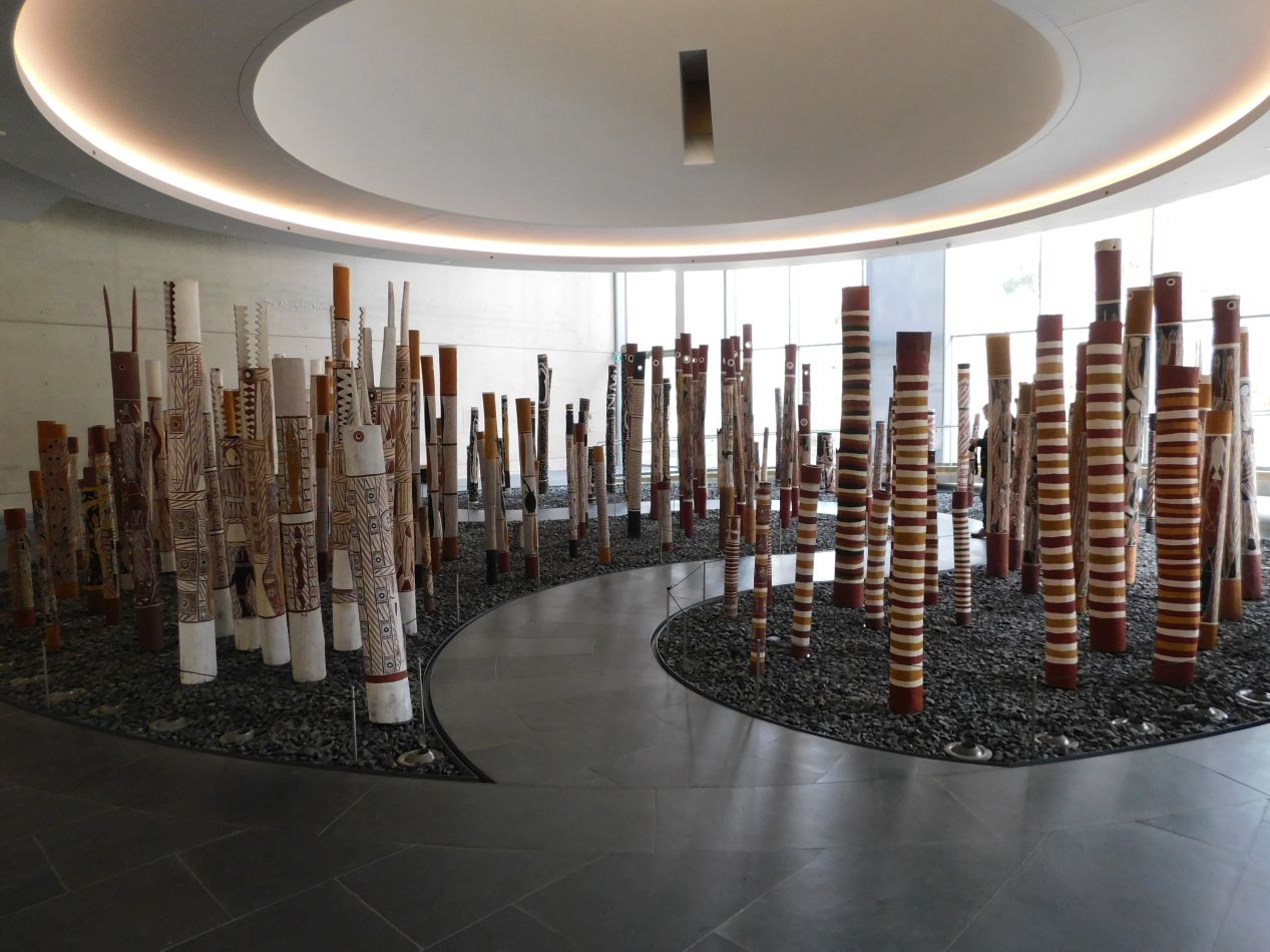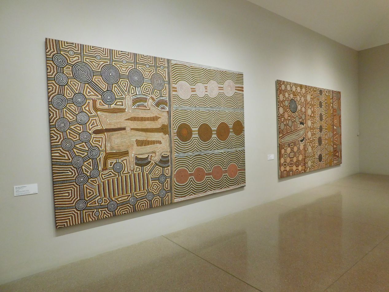 The National Gallery is known in particular for its collection of aboriginal art, which it's generally viewed to have more of than any other art museum in the world. One of the features pieces is named "Aboriginal Memory" and consists of 200 painted tree trunks commemorating all of the indigenous people who died between 1788 and 1988 as Australia was colonized by Europeans. There was a walking path through this sculpture or it could be viewed from above to get a better sense of the scope of the work. This accompanied many galleries of paintings from aboriginal artists, individuals from across Australia that adhered to many different artistic traditions. There are close to a thousand different aboriginal groups across the length of the continent, and it would be simplisitic and wrong to assume that all of them share a particular art style.