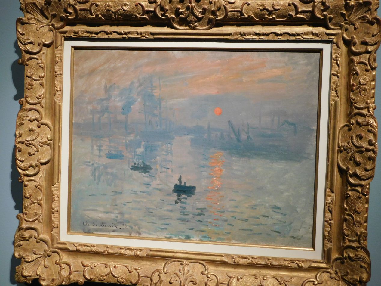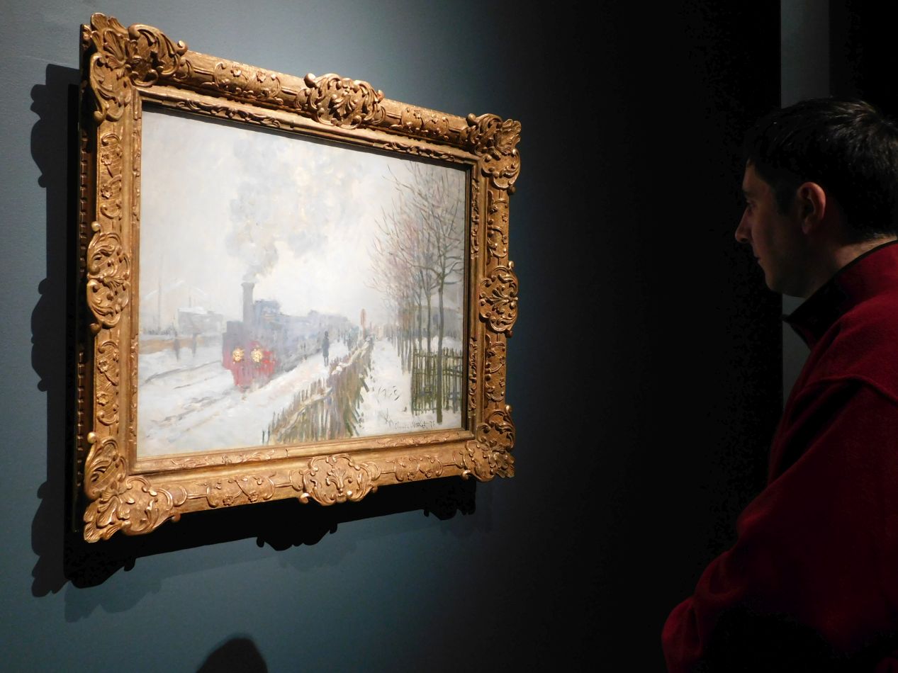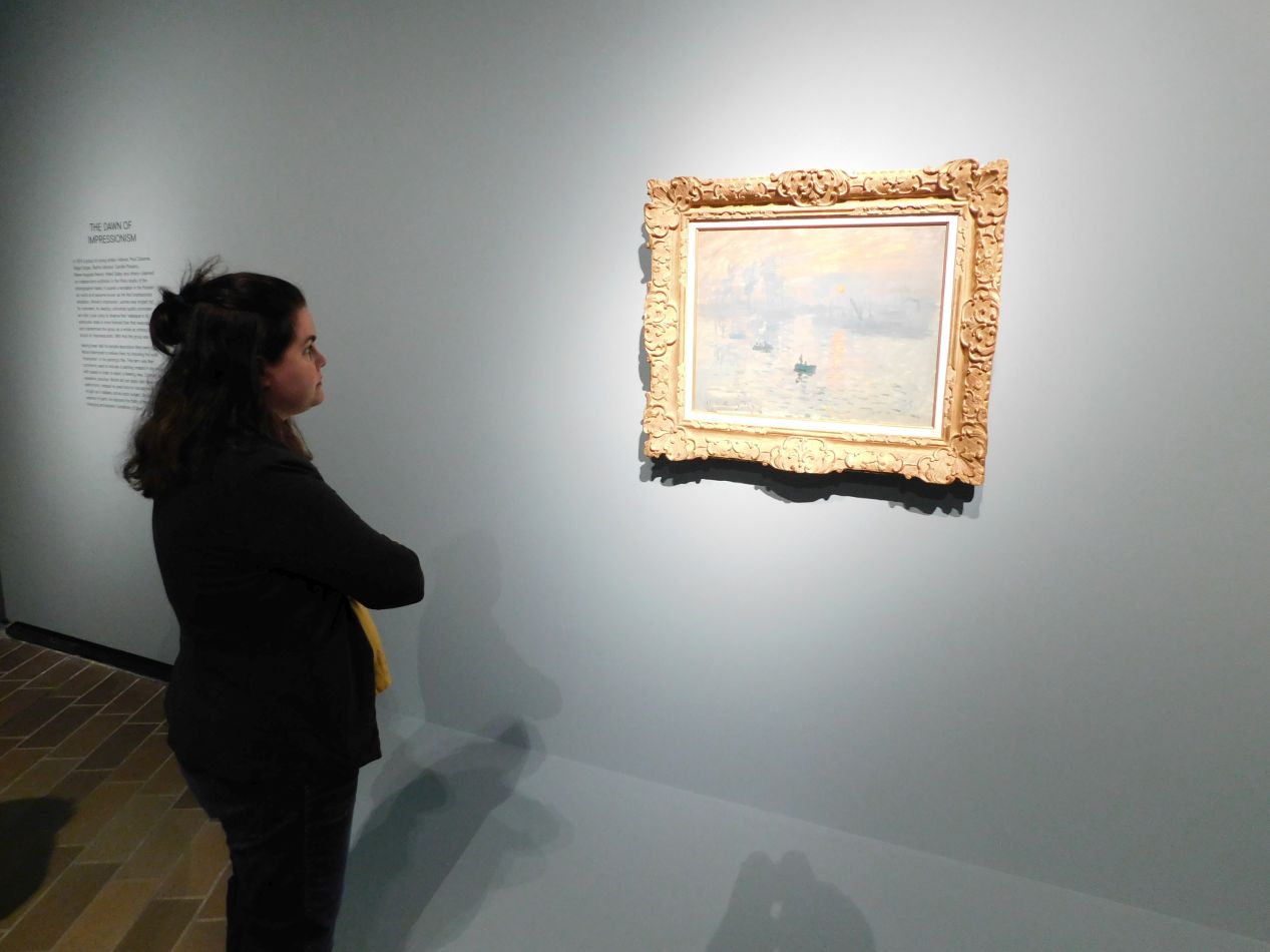 We both enjoyed having the chance to see a number of the Monet works on display here, and the exhibit included my favorite Monet painting, his rendition of a train in the snow ("Le Train dans la Neige"). I've always loved the way that the burry whites of the cloudy sky mix together with the whites of the snowy ground in this painting, as the ghostly impression of a train arrives at the station. It's the quintessential Impressionist painting for me. The big fuss over this exhibit was likely due to the fact that it included Monet's most famous painting: Impression, Sunrise ("Impression, Soleil Levant") from 1872. Everyone has probably seen this image at some point before, but the fascinating part of this exhibit was finding out a lot more of the background about how the painting was created. Art historians painstakingly recreated the time of day when Monet created this work and determined the exact spot in the port city of Le Havre where he was standing when he captured this perspective. I don't love this painting as it's a bit too far on the abstract side for my tastes but it was still fun to see it in person. We both did our best to strike a contemplative pose for these pictures as we gazed at the paintings on display.