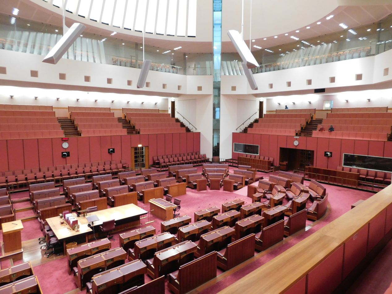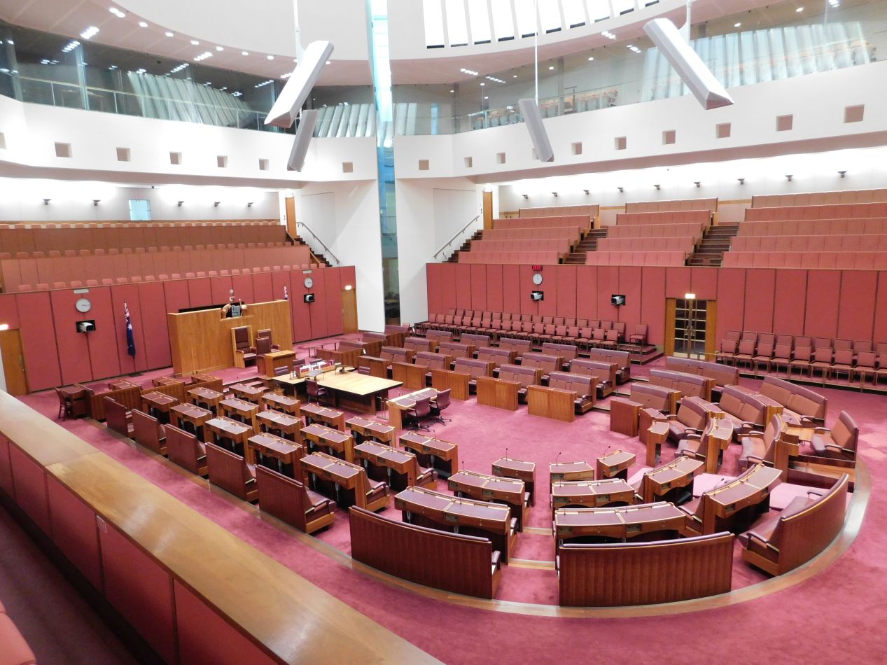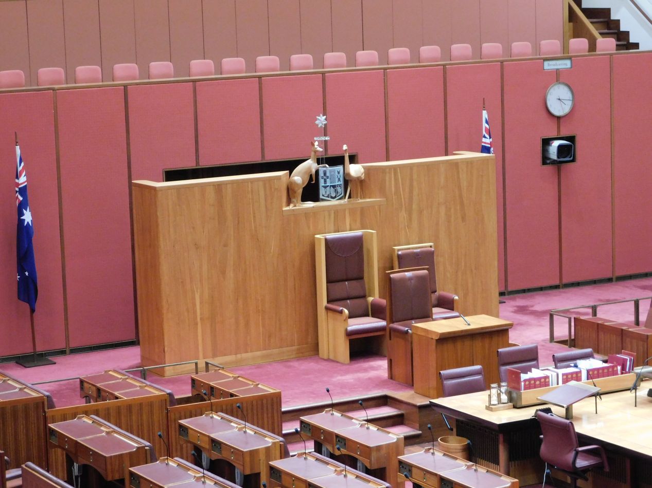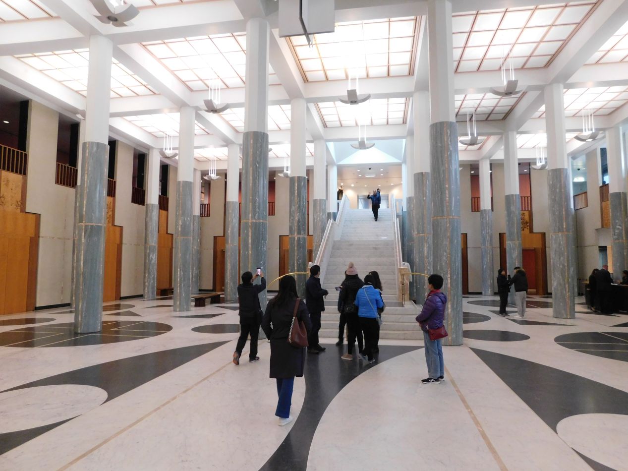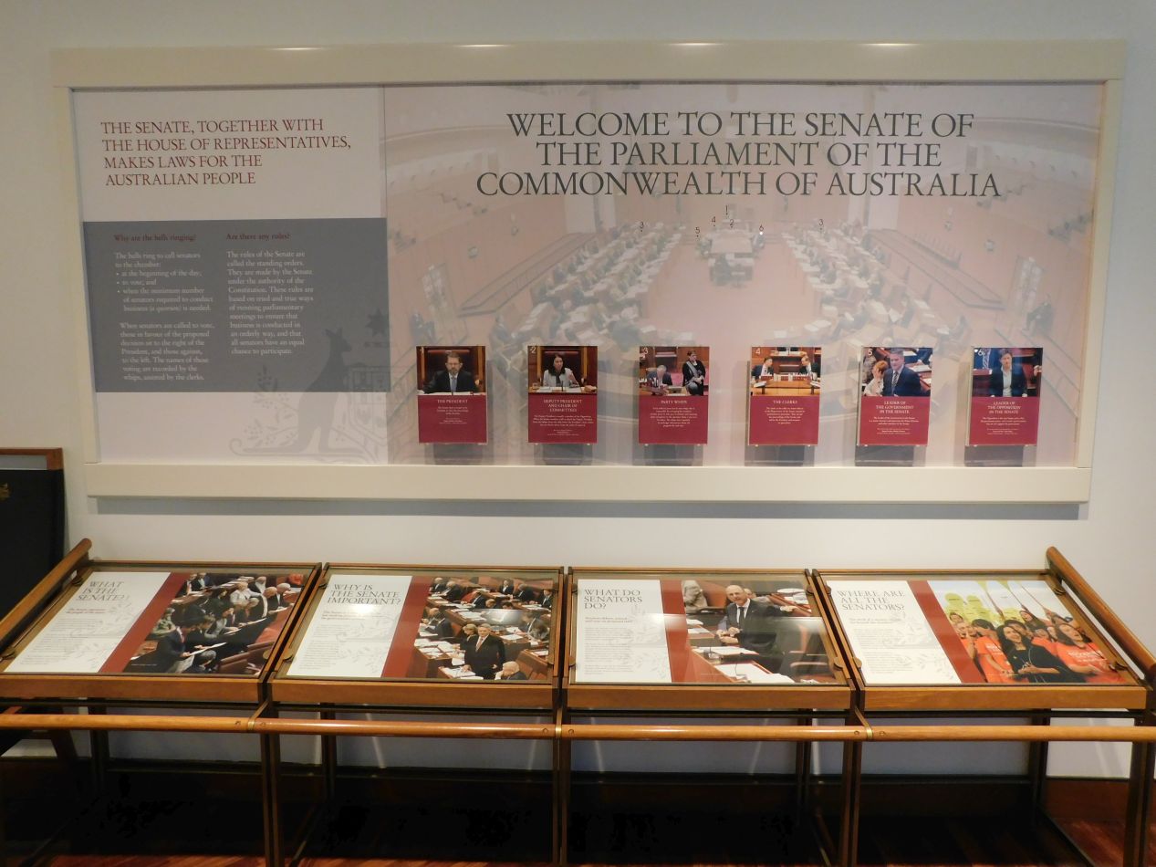 Over on the other side of the Parliament House was the chamber for the upper house, the Australian Senate. The basic design here was very similar, only with half as many seats for the senators and with red instead of green for the primary color. We noticed the same gradation of colors in the Senate as it ran through different shades of red, and supposedly this was intended to evoke the different colors of the Australian Outback, just as the greens in the House of Representatives corresponded to different types of plants. Our tour guide made a big deal in stating that the Australian Senate is "one of the most powerful upper houses in the world", which isn't really true at all. I mean, maybe in the British legislative tradition where the lower house holds most of the power, but certainly not in the rest of the wider world. The Australian Senate does differ from the British House of Lords in the sense that it can actually reject legislation passed by the House of Representatives, however it still falls short of equal status since very few bills originate in the Senate and the larger numbers in the House can outvote the Senate rather easily in the event of a rare joint sitting. The Australian Senate also has equal representation from each state (6 senators from each), which means that Tasmania and New South Wales have the same number of senators, creating a body that's even less democratically representative than the US Senate. All in all, it's kind of a strange hybrid parliamentary system, somewhere between the British and American traditions.