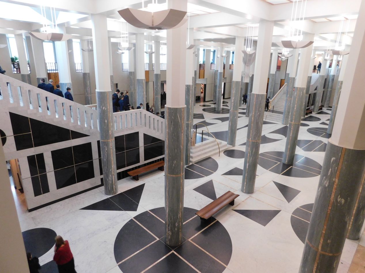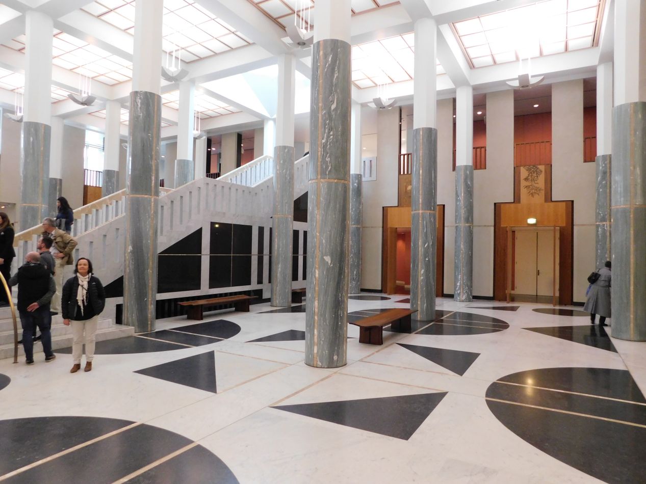 The New Parliament House wasn't very crowded on the day that we visited, a Friday afternoon in the middle of winter. There were a few other tourist groups but we had no trouble signing up for the next visitor tour to take us around the building. The entrance foyer where we waited for the tour to begin was a thoroughly beautiful room in its own right, with columns of green marble holding up the ceiling and creating the feeling of being in one of Australia's forests. Supposedly there's a tiny fossil trapped in one of the floorstones here but I couldn't tell if that was true or just an unusual pattern in the rocks. Connected to the entrance was the Great Hall, the huge empty room shown above in the last picture. This room is used for various state functions whenever there's a need for a large open space. There was an enormous tapestry taking up the whole back wall of the Great Wall, designed to look like a forest as conceived by painter Arthur Boyd. It measures an astonishing 20 x 9 meters (65 x 30 feet) and is one of the largest tapestries ever created.
