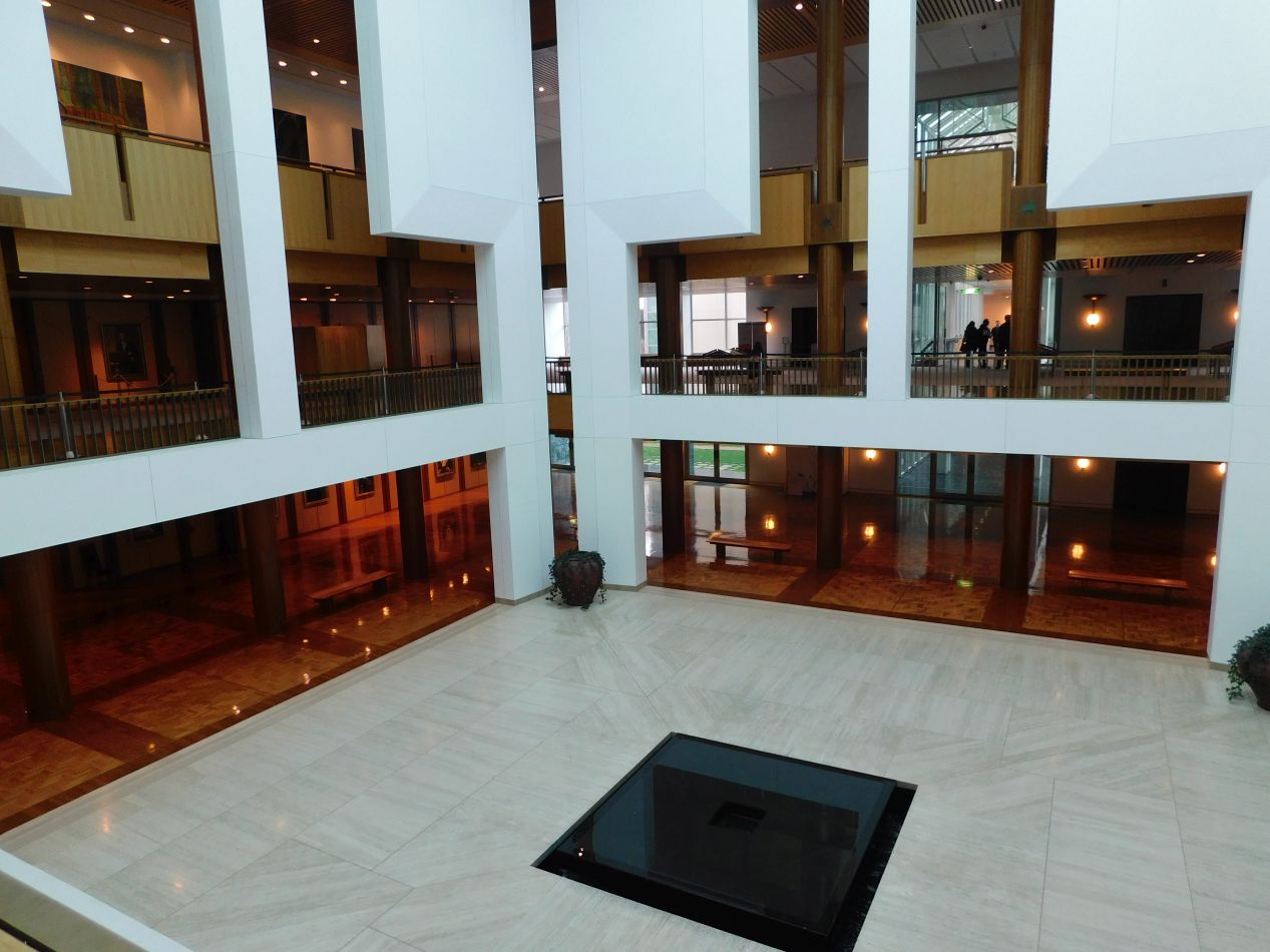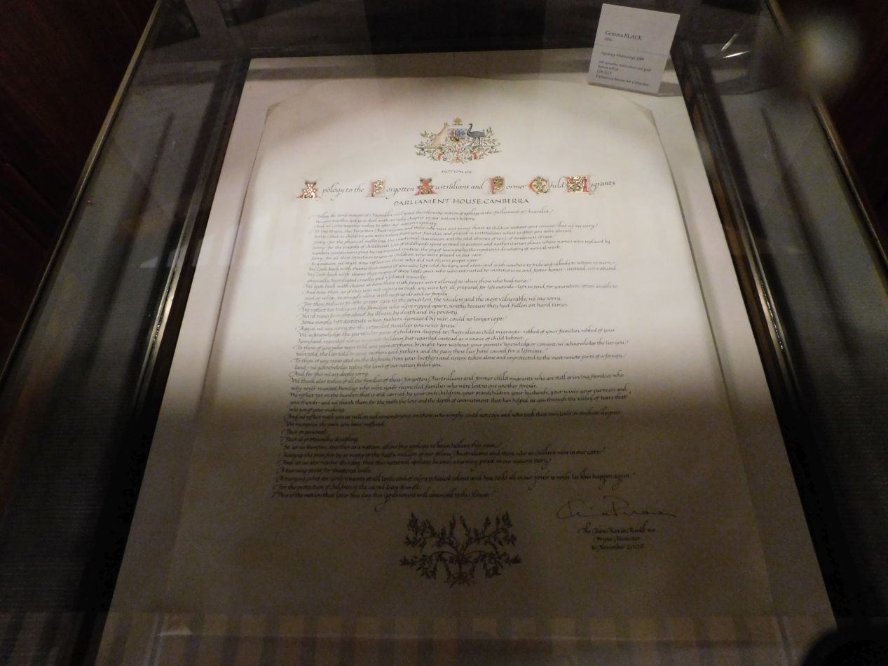 These pictures are from the interior of the parliament building, the connecting area between the two wings directly below the central flagpole. There was a skylight here in the middle of the structure where we could look up and see that, yes, it was still raining outside. Some of the walls held commemorative paintings of Australia's previous prime ministers, and one of them very clearly stood out from the rest. That was the painting of Julia Gillard, Australia's first and to this point only woman to serve as prime minister, who had her portrait captured in a notably distinct style from the long succession of her more traditional male predecessors. There was no question that it made a bold statement hanging here in the Parliament House. Elsewhere, we could see out the windows to some of the many outdoor gardens, which are often used by MPs for press conferences when the weather is more cooperative. There was also a small archival area with different famous documents, such as a copy of the Magna Carta (not an originally unfortunately) and this formal apology to Australians who were brought to the continent against their will. Even if such a gesture was a case of "too little, too late" it was still a kind gesture to make.