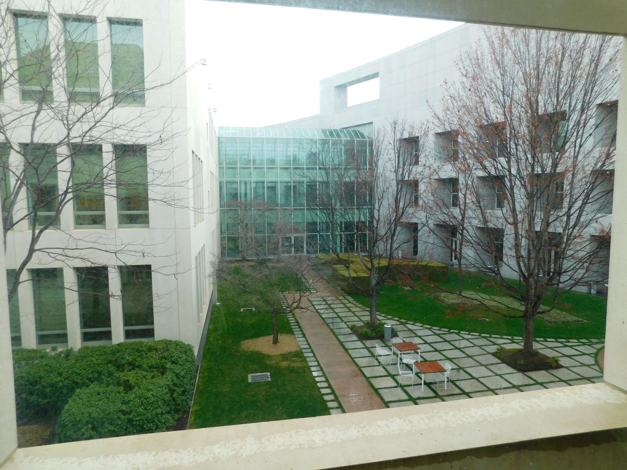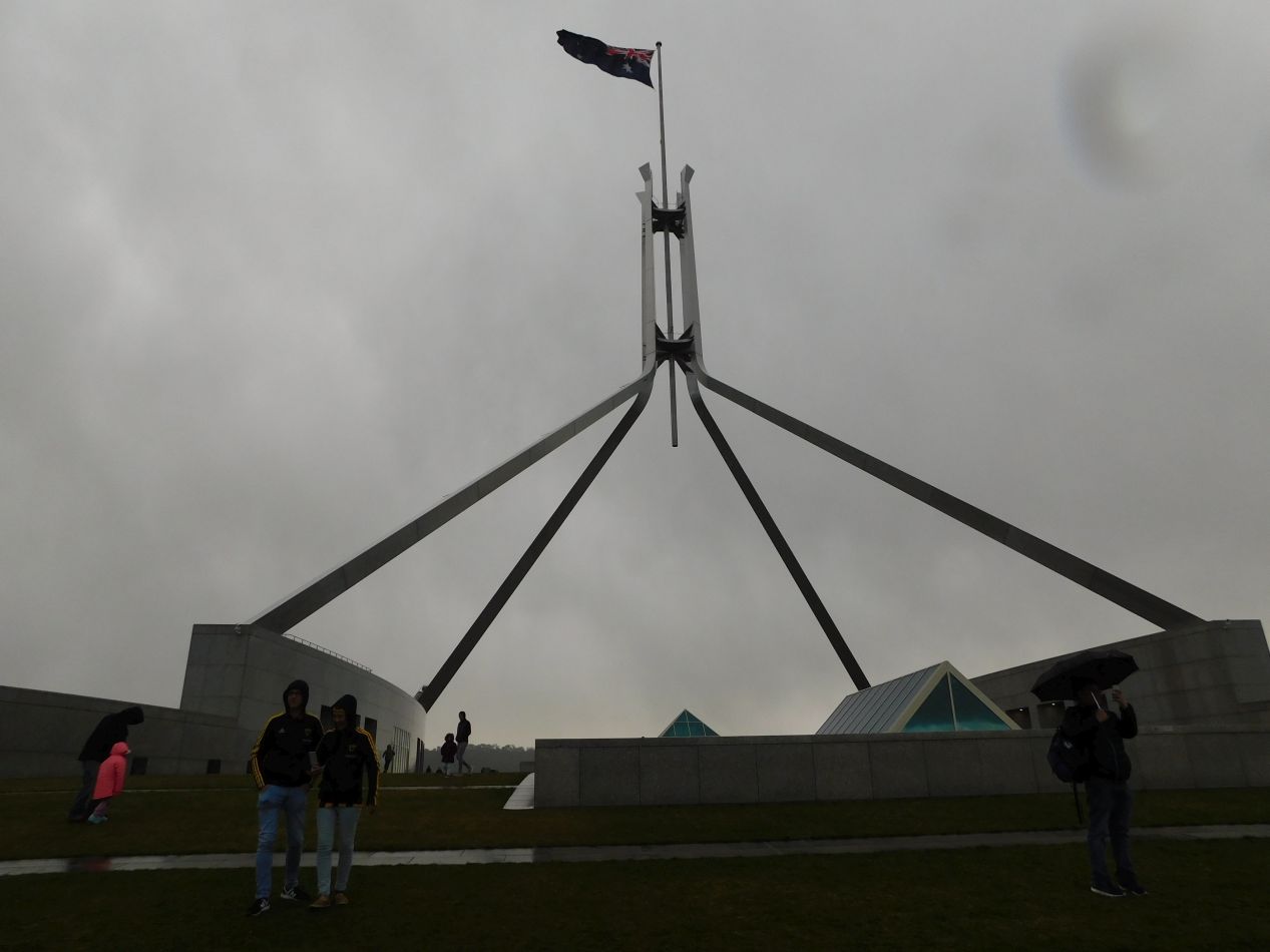 Since Canberra is a planned city, the major government buildings are all situated on sight lines connecting them together with one another. The simplest of these connections links together the Old Parliament House with the New Parliament House, with the more recent building situated slightly further up the same hill from the older building. It only took a few minutes to walk up the hill towards the newer building, and from that vantage point we could look downhill at the white-colored Old Parliament House, followed in the distance across the lake by the Australian War Memorial and Ainslie Hill beyond it. Or at least we would have been able to see that far if the weather didn't continue to remain foggy and raining outside. I'm omitting the picture of the two of us in front of the New Parliament House because we both were soaked from the rain. Weather aside, the new parliament building had a highly unusual appearance, built into the side of the hill and therefore presenting a low profile. The idea was to maintain the natural appearance of the landscape rather than tearing it apart, something that both of us appreciated in the architecture. The place is designed to look like a pair of boomerangs, and no, I'm not joking about that. The Australian Parliament really does resemble an object made famous by the movie Crocodile Dundee.