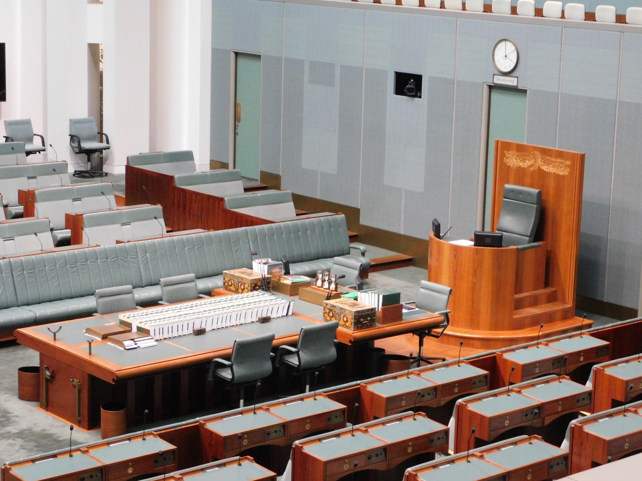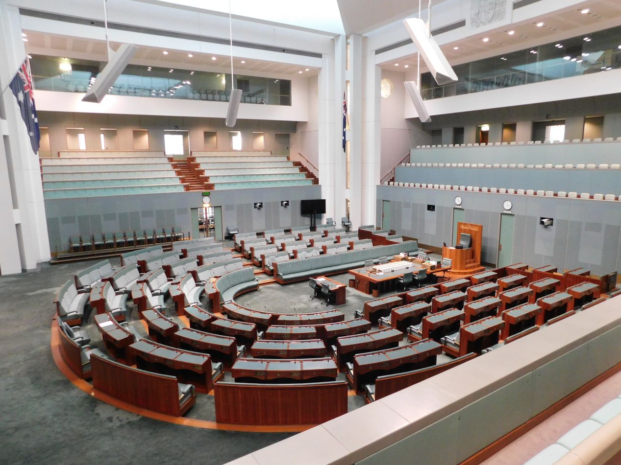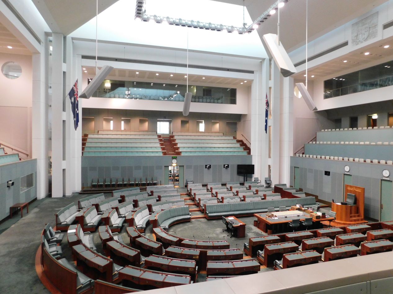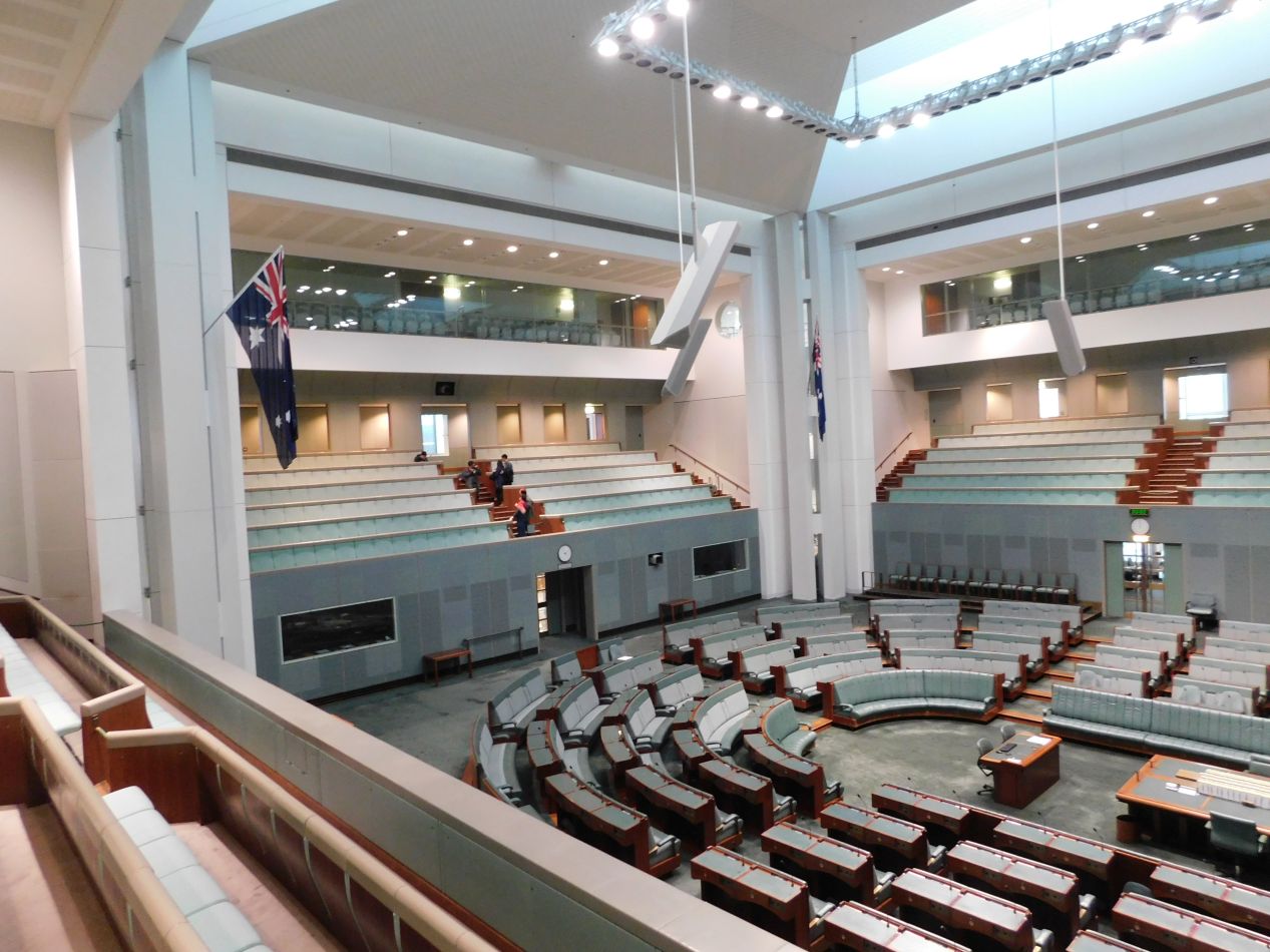 The tour continued onwards to the House of Representatives, the Australian version of the British House of Commons. This current version of the House of Representatives was far larger and more modern than the one we had seen in the Old Parliament House, with the Australian MPs having much more comfortable-looking seating in a circle ringing the central bench. The color scheme was again green here, but with varying shades that ranged from a dark color down at the speaking floor up to a pale green near the top of the seating galleries. It looked a little bit like one of those charts of paint samples from a home repair store where customers compare a whole bunch of different shadings to get the exact color they want. In any case, this was a beautiful and unique setup for a parliament chamber, very much modern and forward-thinking while also retaining a sense of scale and grandeur. I certainly wouldn't get this place confused with anywhere else; it was unique amongst the many legislative chambers that I've visited.