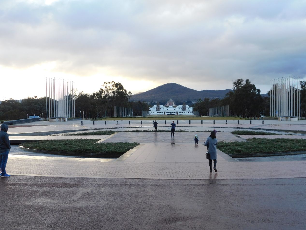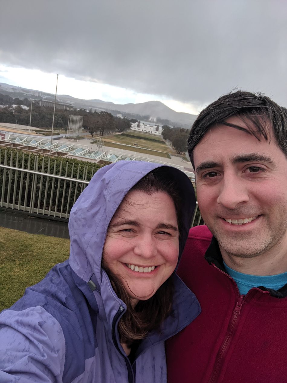 After the tour finished, we took the elevator up to the roof of the New Parliament House to check out the views from up there. On a normal day these would have been spectacular, looking out over the Old Parliament House and across Lake Burley Griffin to the Australian War Memorial. Unfortunate the poor weather conditions continued make for a miserable day outside, with a mixture of heavy rain, cold temperatures, and obscuring fog. We couldn't see too far in the distance and the wind was whipping around something fierce up on the rooftop. The two of us look somewhere between resigned and miserable in the selfie that we took together up on the roof. We didn't spend much time here before heading back inside to warm up and dry out as best we could. Later on, we spotted a little bit of a sunset as we left the Parliament House and it was clear enough for once to see the War Memorial off in the far distance. That didn't last though as the rain poured down on us again before we could make the 10 minute walk back to our rental car. The weather was just not very nice on this day. (If you're curious what the New Parliament House looks like from above on a sunny day, here's a very different image from Wikipedia.)