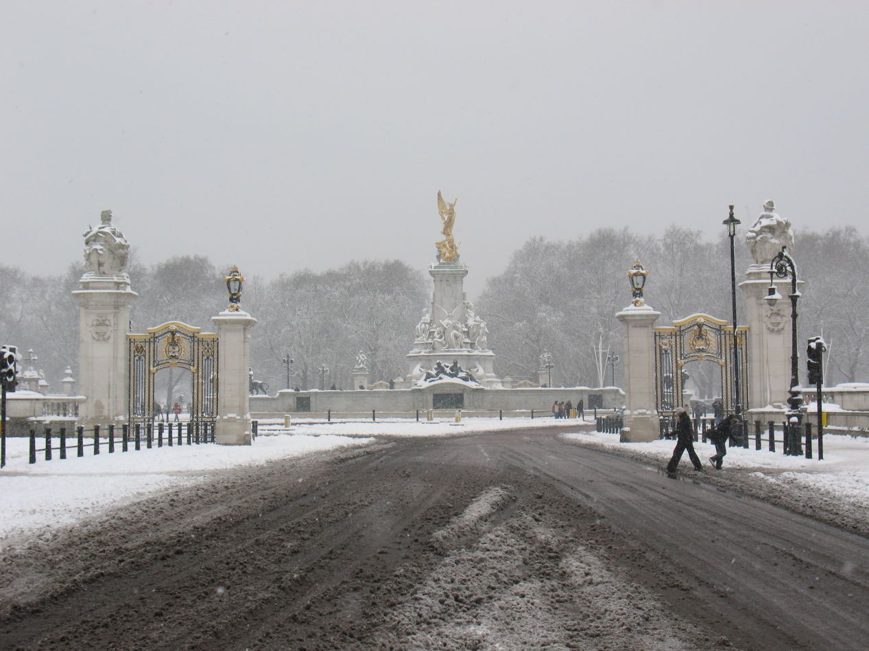 I wrapped things up by walking through St. James Park to the royal palace at the end of the lake. The snow accumulation was heavier in the park and it almost felt like being out in the woods somewhere despite the urban environment. The sight of the Queen Victoria statue outside the palace was ruined somewhat by the muddy gray slush of the roadway surrounding it, an inevitable side effect of needing to keep the roads open to traffic. Buckingham Palace itself stood tall and serene against the blizzard outside, seemingly unconcerned by the effects of the winter weather. There were more people here than the other places I'd visited on the day, if still well short of the normal throngs of tourists. A good number of London residents were enjoying the uncharacteristic snowfall by building snowmen and having snowball fights in the park. This was the time to do it before the snow all melted away.