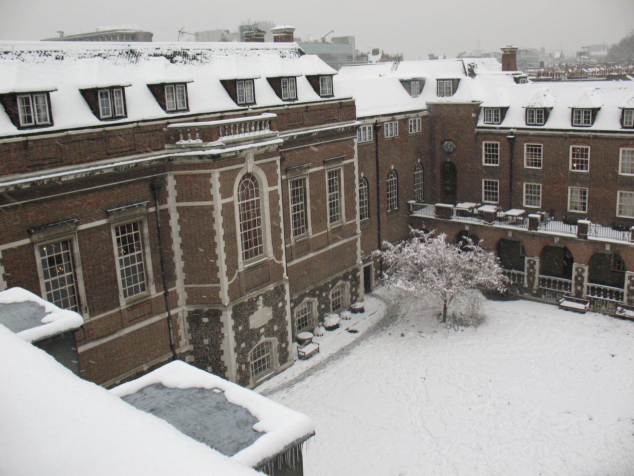 This was a rare opportunity indeed and I was determined to make the most of it. I bundled up against the cold as best I could and set out to spend a few hours capturing the sights and sounds of London during this snowstorm. I started out by taking some pictures of Goodenough College, which had been blanketed under roughly six inches / fifteen centimeters of snowball. The greenery in the courtyard had been replaced by a layer of soft white, and if this wasn't enough accumulation to be a true winter storm, it was still quite pretty indeed. Compare back to the images of Goodenough College on the previous page to get a sense for how the snowfall had transformed my normal living area.
