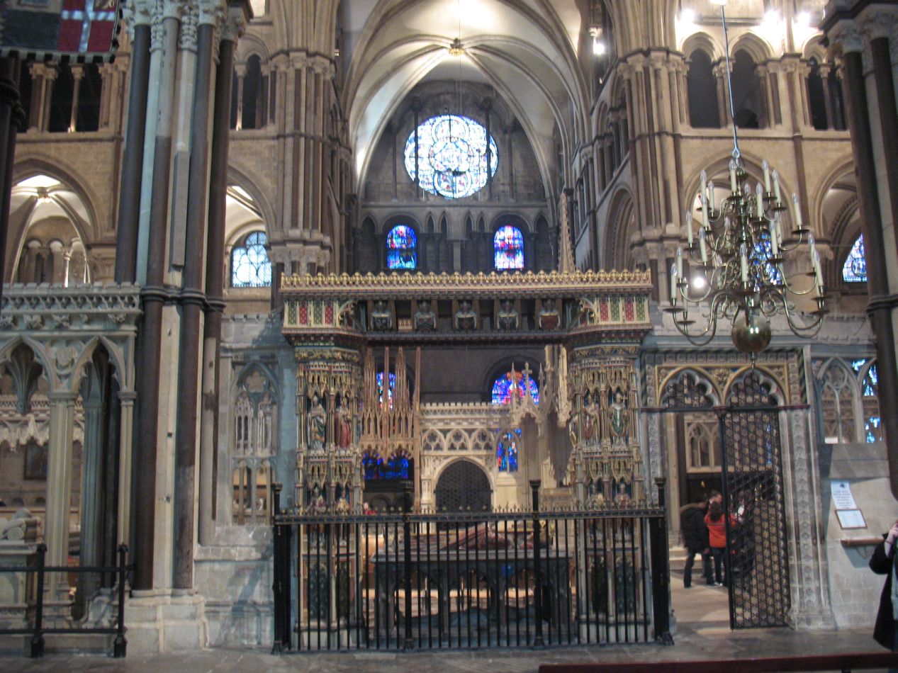 My favorite part of the cathedral was the choir portion, which was located in the center of the building about two thirds of the way up from the entrance. This is where the cathedral's famous youth choir performs, and the natural acoustics from being in such a large enclosed space are amazing. The choir was in the process of rehearsing when I visited the cathedral and I heard their director leading them repeatedly through a particularly difficult section until he felt that they had gotten it correct. The visuals here were just gorgeous, as I could look to the west back towards the nave and the entrance, or to the east as it sloped up to higher ground where the small Trinity Chapel was located. This was where the deeply religious knight Edward Plantagenet, the "Black Prince", was buried in a small tomb off to the side of where the choir was rehearsing. The Black Prince was the heir to the English throne but died before his father Edward III and therefore is known to history by his title of prince. It was a stunning place to be buried even if the sight of his tomb next to the young choirboys was a bit odd.