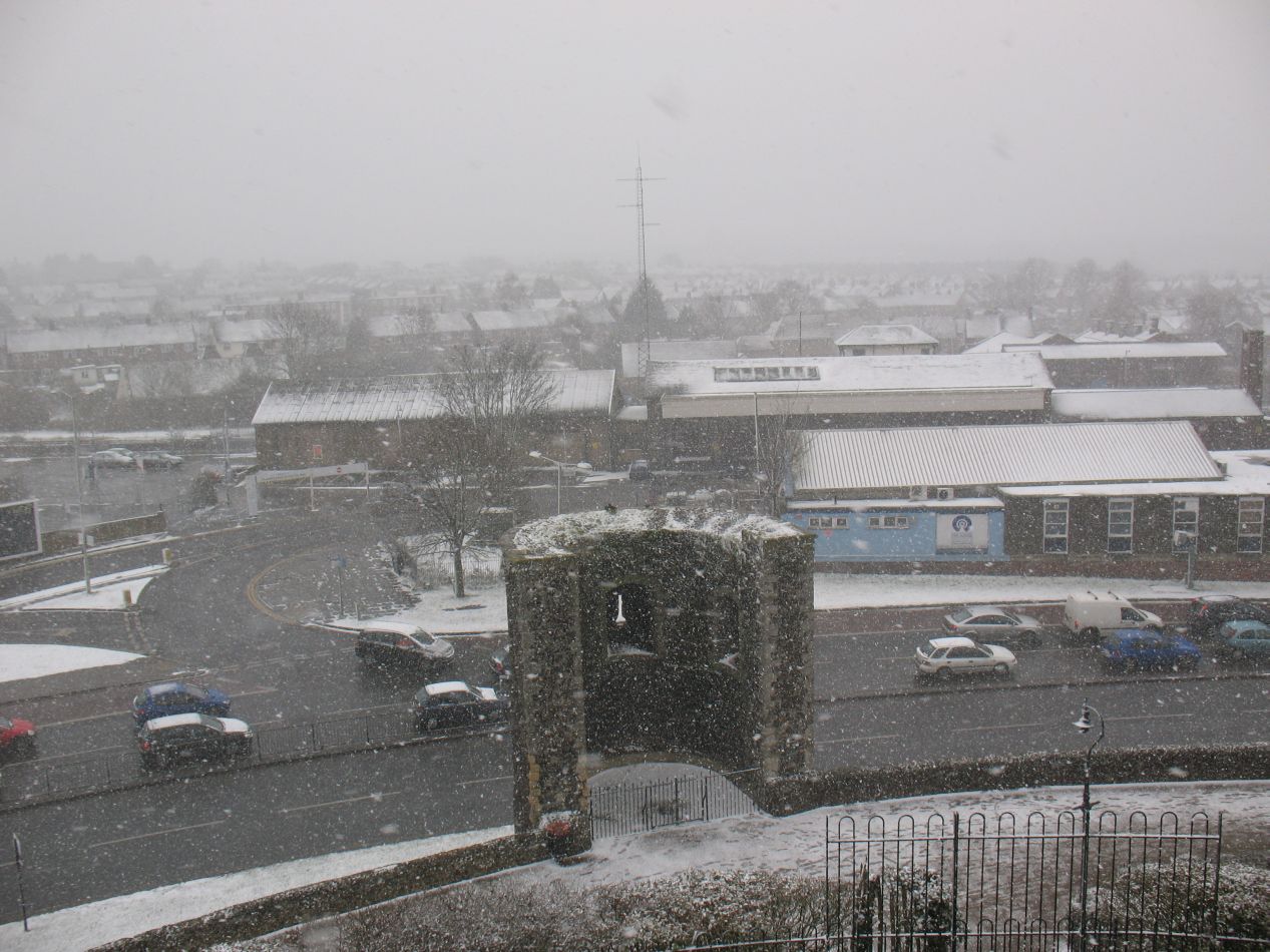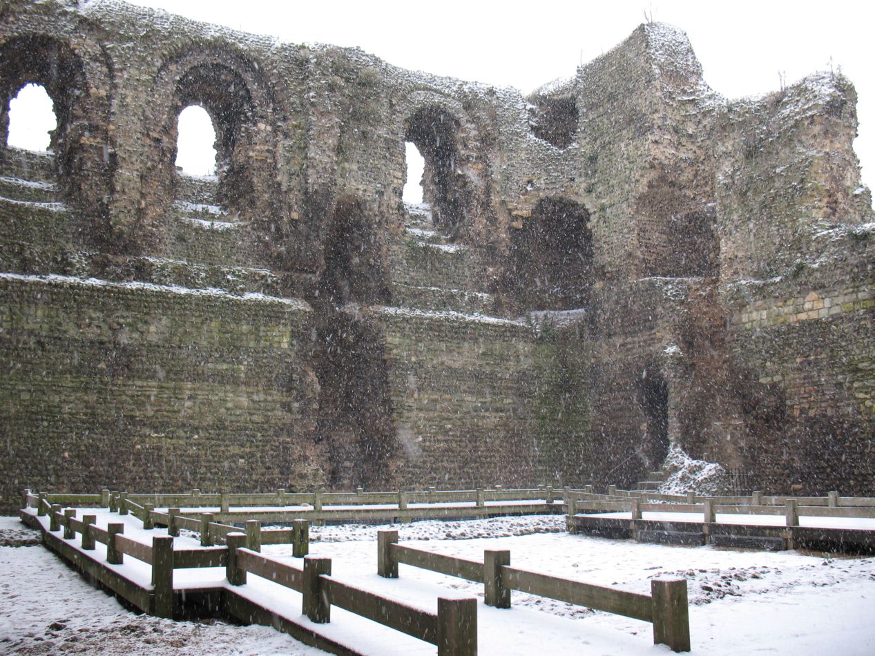 If anything, it was snowing even harder when I left the cathedral and headed back through Canterbury town. I didn't have a map of the area, but I'd seen signs for something called Canterbury Castle and wanted to see what that entailed. I passed by a smaller stone church named St. Mildred's and soon reached the castle itself. Or at least the ruins of Canterbury Castle, as there wasn't much remaining of the place. The castle dated all the way back to Norman times when it was built in the early 12th century to safeguard the important Roman road from Dover to London. At one point this massive stone building would have stood as much as 80 feet / 25 meters tall and dominated the local landscape along with the cathedral. The castle was used as a prison for long periods of time before being purchased by a gas company in the 19th century, when it was used for gas storage and suffered considerable damage. Argh, where was the historic preservation back then! The building is an open-air shell of its former self today, and it seemed to be haunted by the ghosts of the past when I visited amidst the snow. Those empty window frames looked all too much like eyes, and this place was downright spooky in its deserted space.
