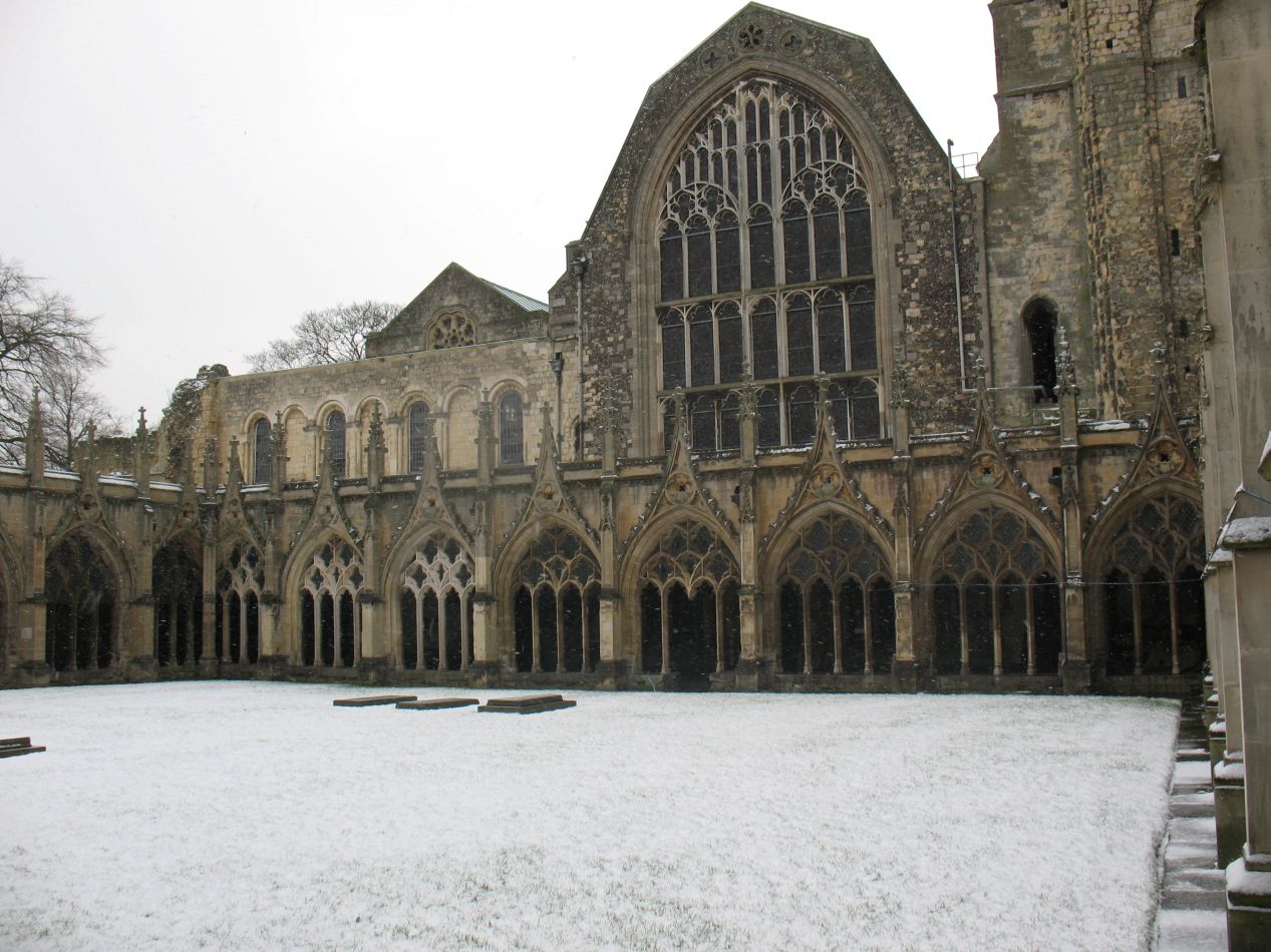When I passed through the gate, I was greeted by the same sight that generations of pilgrims have experienced: Canterbury Cathedral. This grand cathedral serves as the headquarters for the Church of England and has been the spiritual centerpiece of English faith for the last thousand years. The original church at Canterbury dates back to the Anglo-Saxon period, when St. Augustine of Canterbury (not the more famous St. Augustine of Hippo) arrived in Britain in 596 as a missionary to convert the pagan inhabitants. This was necessary since the people of Roman Britain had earlier converted to Christianity, only to see the region revert back to paganism in the wake of the Germanic arrivals in the 5th century. St. Augustine's initial church was destroyed by fire and rebuilt repeatedly over the centuries, with the current enormous building dating mostly to the 12th and 13th centuries. The snow continued to swirl around me as I took an initial walk around the exterior of the cathedral, marveling at the size of the place. This is both one of the largest and oldest cathedrals in England.