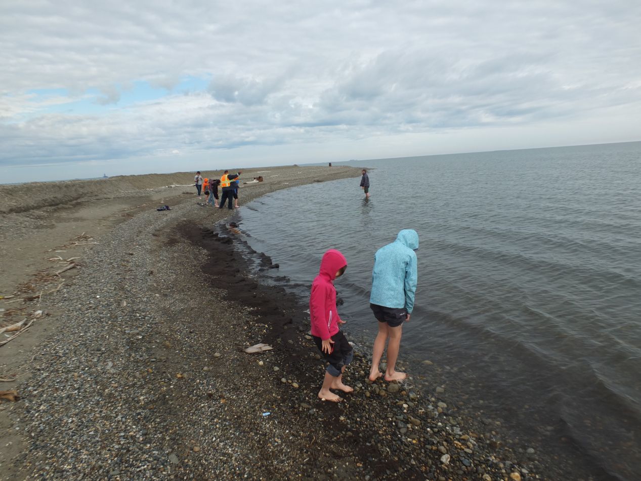 The highlight of this trip was a stop at the Arctic Ocean, in the mouth of Prudhoe Bay itself. Our bus pulled to a stop at the end of another gravel road, on a small spit of land jutting out into the huge body of water. Off in the distance, we could see offshore oil rigs engaged in dredging up more crude oil from beneath the ocean's shallow floor. The beach itself was rocky and flat, with little in the way of sand but plenty of scattered driftwood bleached white by the sun. Unlike many other beaches that I've visited, there was nothing in the way of tourist attractions, no stores or shops or boardwalks. There was also nothing in the way of plant life here, no grasses or trees or anything green and growing. The only things present were various pieces of industrial machinery stowed further along down the beach. Under an overcast sky and sitting next to the slate-gray waters of the Arctic Ocean, this was one of the most desolate spots I can remember visiting.
