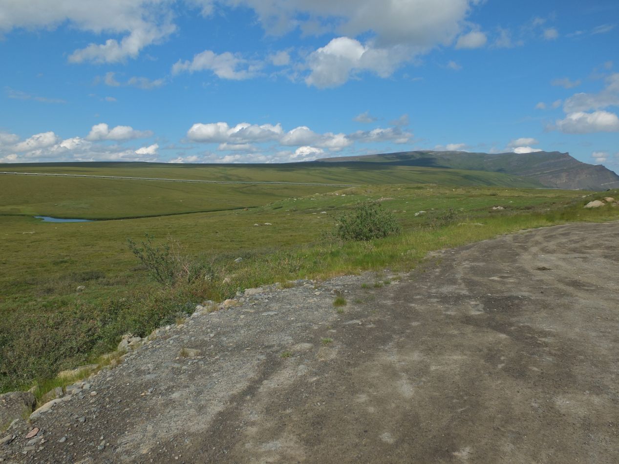 Still continuing to follow the pipeline north, I soon reached the official boundary of the Arctic Circle at 66°33' degrees latitude. This is the northernmost point on the Earth's surface where the noonday sun is visible during the winter solstice, and similarly the northernmost point where there's any darkness at midnight during the summer solstice. Further north from here, there's permanent daylight in summer and permanent darkness in winter. This is all caused by the Earth's tilt on its axis, and there's lots of fascinating information about how the whole process works out there on the Internet. (One Wikipedia page explained that the Arctic Circle is not a fixed point because the Earth's axial rotation fluctuates slightly, and the Circle is moving north at about 50 feet per year at the moment.) For my purposes here, I had been getting short periods of darkness each night in my travels thus far, with the nights shrinking as I continued to move north. From this point on, I would be experiencing endless daylight for the next four days.