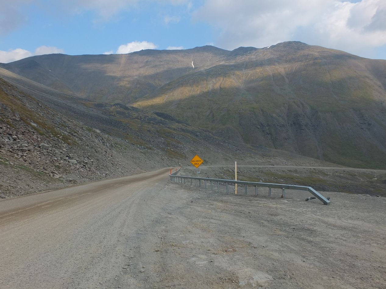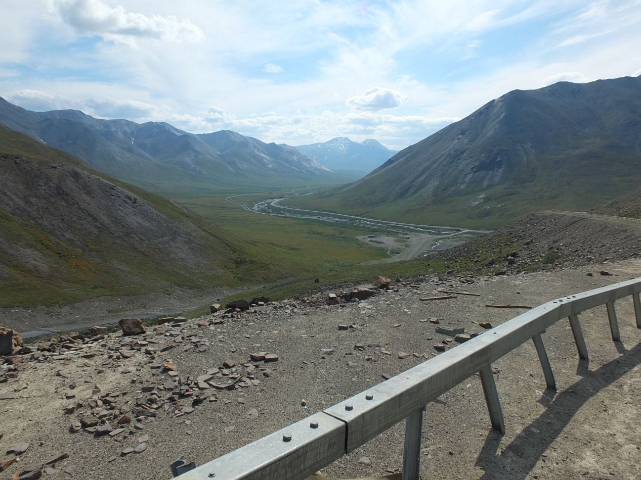 After a few hours of driving, I reached Atigun Pass where the highway traverses the Brooks Range. On a map of Alaska, this is the northernmost range of mountains, although significantly shorter in elevation than the ones down by Denali. Crossing them is still a tricky feat though, and the same mountains off to the west are part of Gates of the Arctic National Park. I would have gone there to see more of the scenery, except that the park has no roads or trails at all, and can only be accessed via plane. Here on the Dalton, the road tilted upward sharply, snaking back and forth as it gained several thousand feet in elevation. The vegetation dropped away completely as I climbed, leaving Atigun Pass with nothing but bare rocks and gravel. Snow clung to the surrounding mountains, laying in patches here and there that fell out of the sunlight. This is the most dangerous part of the Dalton, and I don't even want to imagine what driving through here would be like in winter. This is the most common place for accidents to take place, and people die on the Dalton every year. Fortunately summer is a very different story than winter, and by driving slowly and keeping a sharp eye out, I didn't feel as though I was in any particular danger. The scenery in the mountains was a nice break from what I had been seeing thus far in the valleys below.
