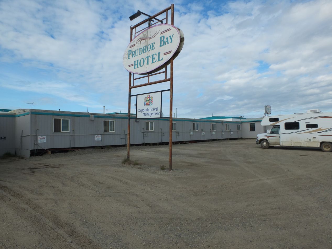 I was staying at the Prudhoe Bay Hotel, where I had booked a reservation ahead of time at an exhorbitant price of $160 for the night. Like in Coldfoot Camp, there are virtually no options on where to stay and the hotel owners can charge an absurd rate. I included a picture as well of the Aurora, another residence for the oil workers, to include the current temperature at the time. Deadhorse sits at just above 70 degrees latitude, and here in early July the temperature was 50 degrees Fahrenheit (10 degrees Celsius) during the late afternoon. It did get a bit colder at night, or should I say "night" since the sun never set, although not as cold as would happen during a normal day/night cycle. Note as well the little dangling power cords in the parking lot of the Aurora; the Prudhoe Bay Hotel had the same thing extending from the front of the building. Those are electrical cords designed to be plugged directly into the car engines to keep the gasoline inside from freezing during the winters. It gets ridiculously cold in this area during the winter, and automobile engines can't operate without taking special precautions to stave off the cold. I was visiting at the hottest part of the year and it was still close to the freezing point.