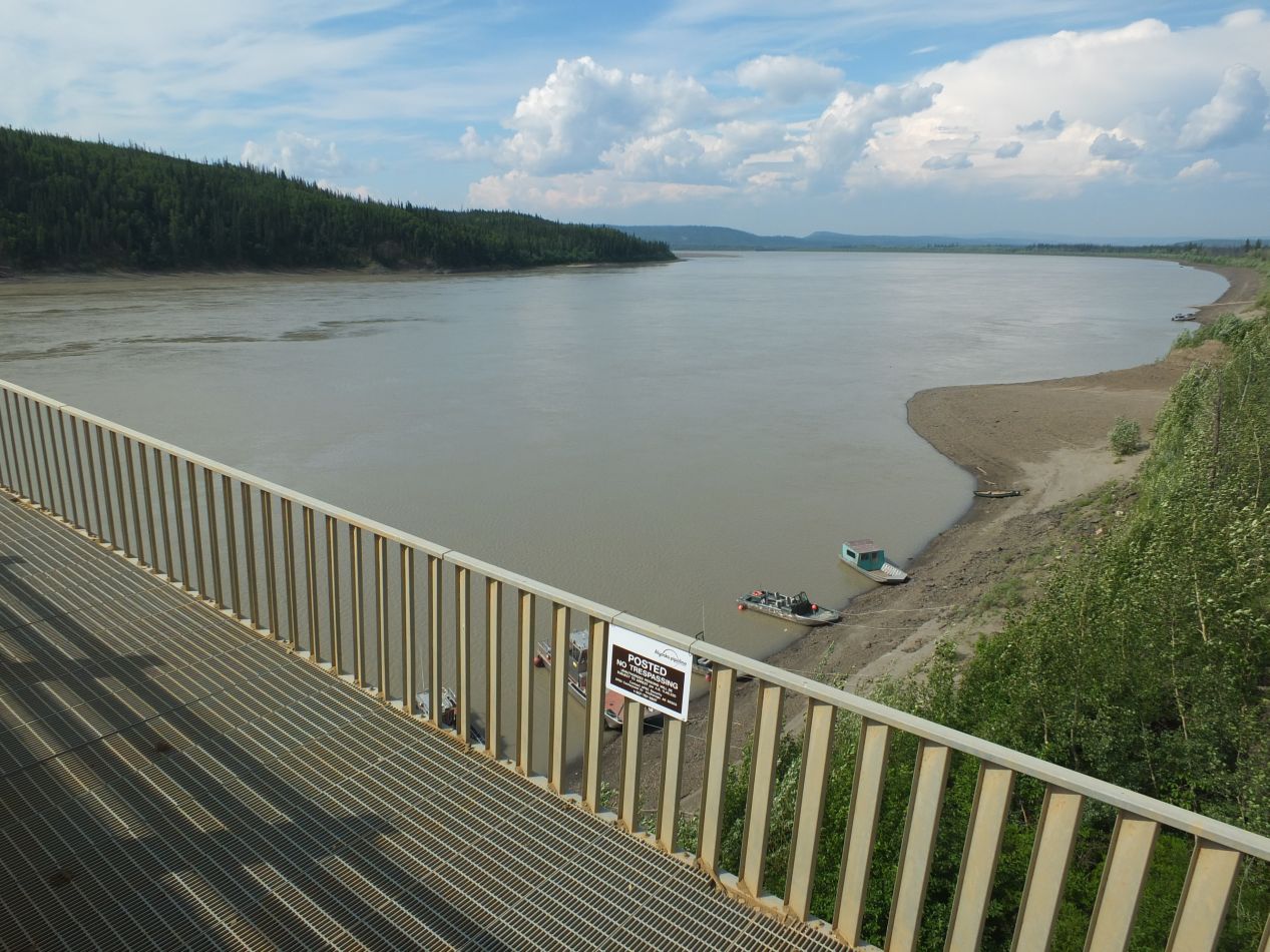 The first stop along of interest along the Dalton comes at the Yukon River crossing. The bridge across the river was one of the most difficult feats of engineering during the construction of the pipeline, and there's a small information stand with details about how it was made. Even today, the bridge consists of wooden planking atop a concrete and steel base, and it lacks anything in the way of elegance or grace. This bridge is designed to be functional, and it serves its purpose well. The Yukon River itself is surprisingly one of the longest in North America, running the full length of the state of Alaska from east to west and swelling to a great size by the time it reaches the Bering Sea. It freezes in the winter and has long been used as a method of travel atop the ice. Here in summer it tended to look like most any other river, aside from running through such a vast stretch of empty wilderness.
