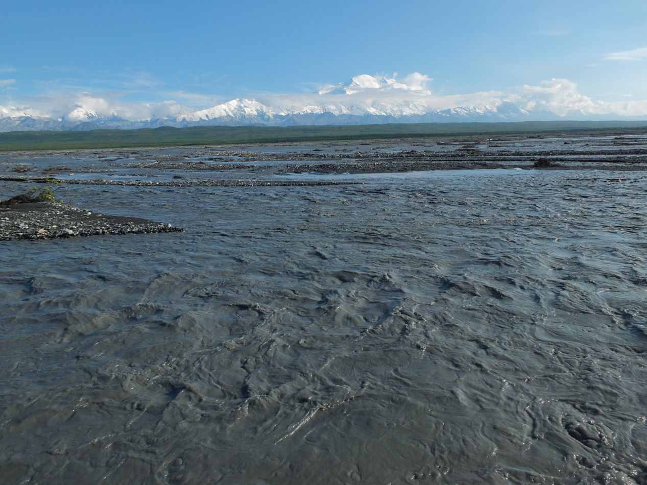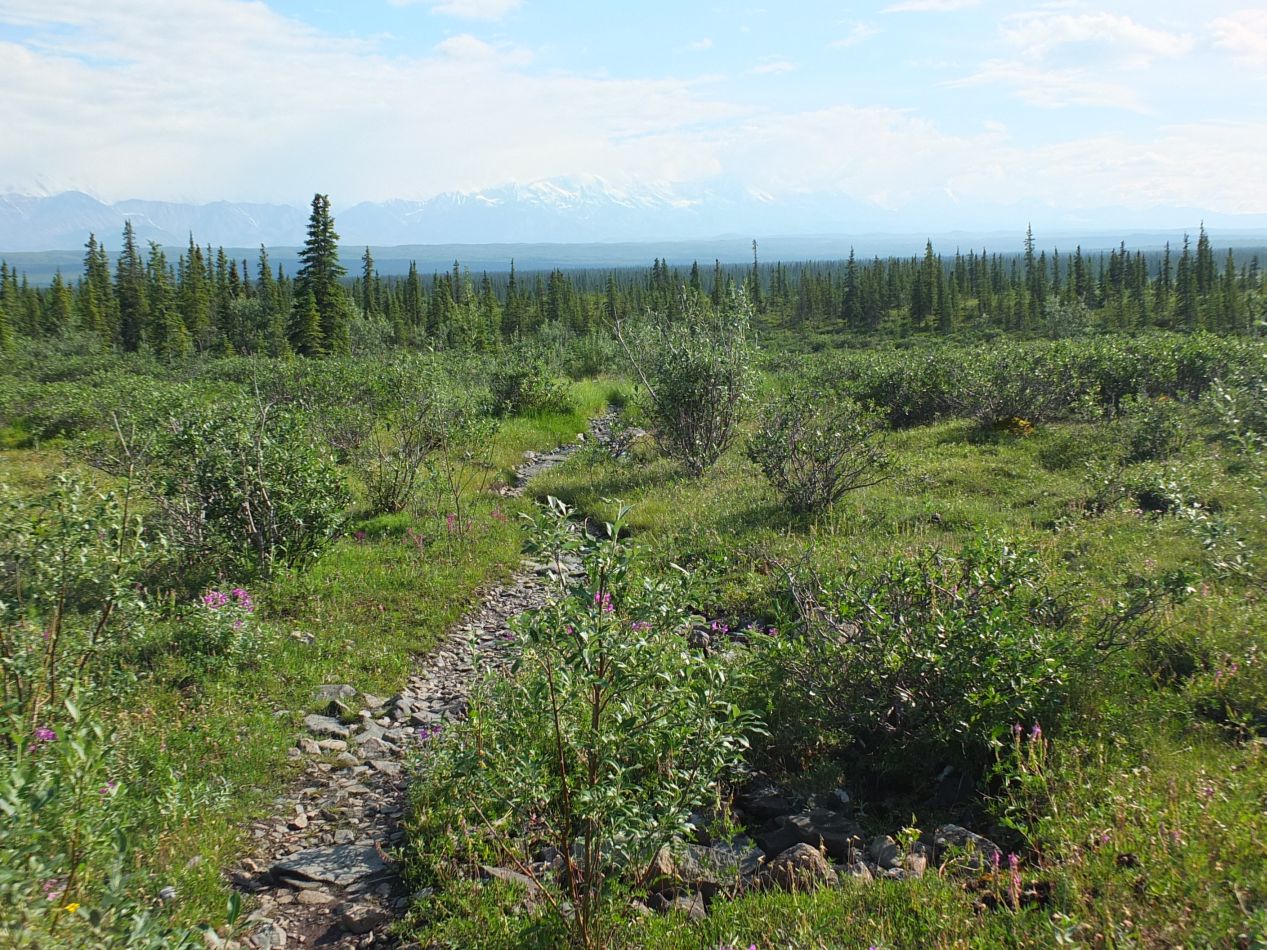 There was a small hike that I had marked out to do this evening after setting up camp, an easy 6 mile roundtrip walk on the McKinley Bar Trail down to the McKinley River. The path was flat and easygoing, crossing over small streams of water and passing squat bushes before heading into a shaded forest of pine trees. I noticed that these trees were relatively short, which had to be a sign of the thin soil and rough winter climate in these parts. The trail was utterly deserted, and I saw no one during the hour's walk down to the river's edge. This was well and truly out in the wilds now, almost a hundred miles away from the entrance to the park and a good distance even from the campground at Wonder Lake.