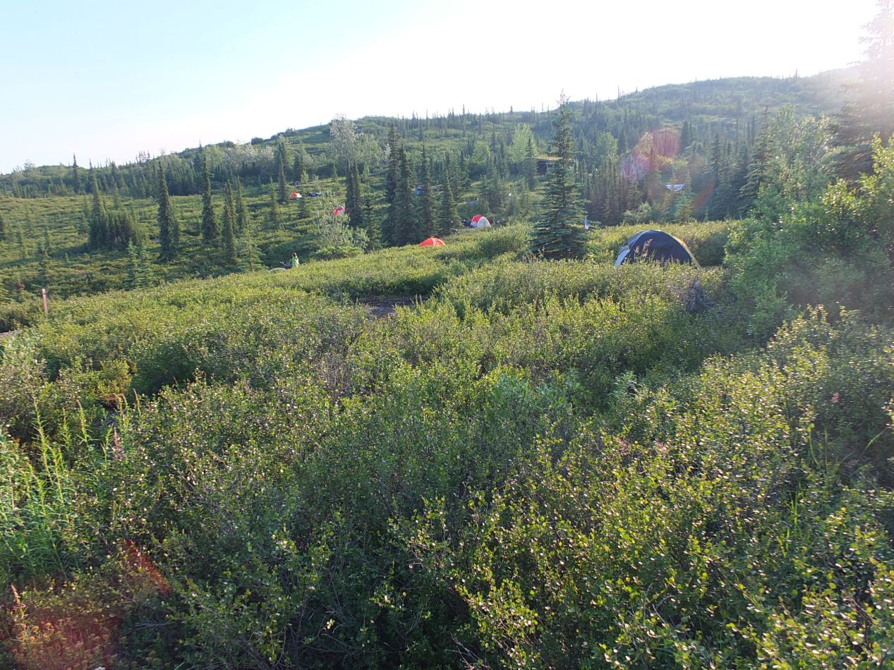 The last stop for me was Wonder Lake campground, where I arrived in the early evening. Located 85 miles from the entrance to the park, Wonder Lake consisted of two dozen locations to set up tents, a basic bathroom, and nothing else. It was rustic and back to nature, just what one would expect. Every campsite was full on this evening, and some of the campers that I had ridden with during the day were kind enough to help me set up my tent. The weather had cleared up nicely by now, and I had quite a view out of the flaps of my tent. If anything, it was too bright outside - the sun wasn't going to set until after midnight!