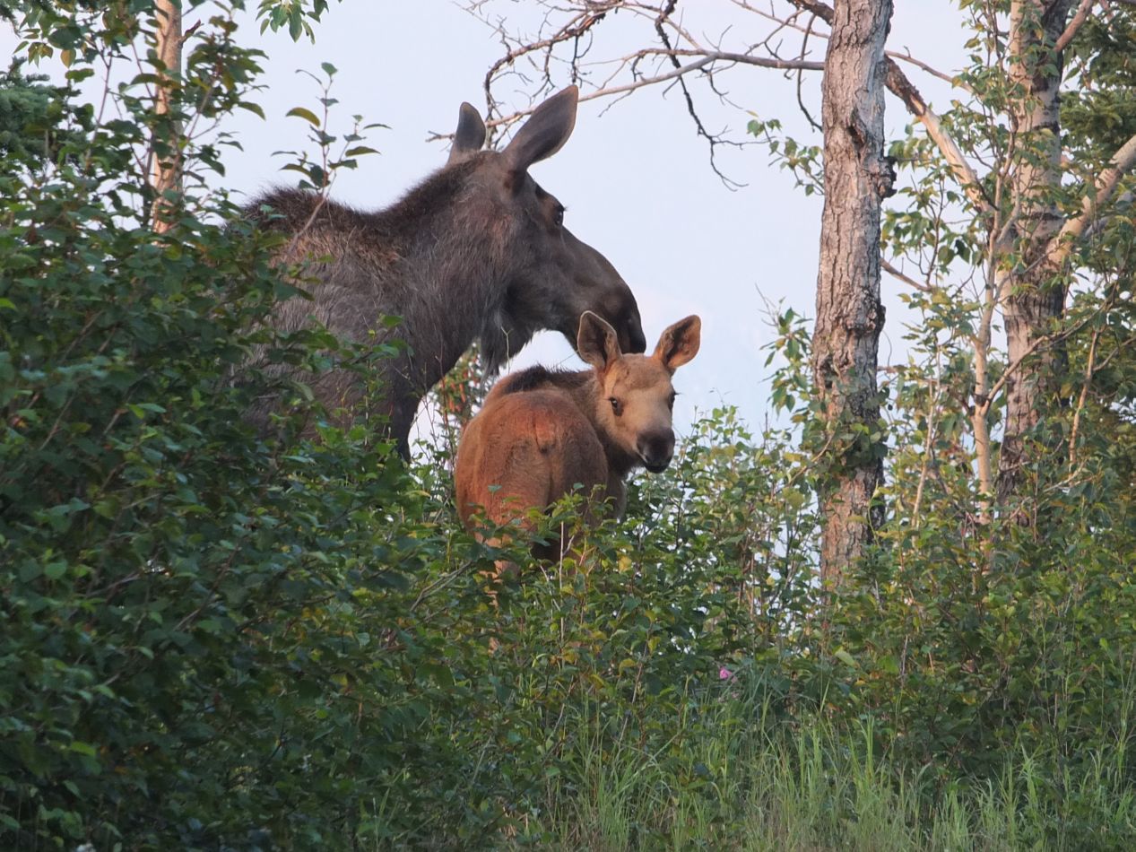 I was walking around the outskirts of the Wonder Lake campsite, only to turn a corner and stumble right into two moose! It was a moose cow and her calf, out eating some of the vegetation in the early morning. A lot of animals are active very early in the day and again at dusk, and it appeared that I had lucked into this animal encounter at just the right time. The moose were close to me, probably too close at barely 100 feet away. Running into a cow with her calf was also potentially dangerous, as she could become spooked and feel the need to defend the youngling if she felt threatened. The last thing I wanted was an angry moose chasing after me. Rather than heed the course of wisdom, however, I froze in place and continued to snap pictures of the pair, even following them slowly at a distance as they ate their breakfast. The moose were clearly aware of my presence, repeatedly shooting glances in my direction and staring right at me whenever I made noise. Fortunately they didn't do anything more than stare, and I guess they didn't feel threatened. Moose are funny creatures to look at, a little bit like huge deer but gawky and awkward in their movements. The calf in particular was absolutely adorable, clearly only a few months old and tagging along with its mother for protection. I had been fortunate enough to see a moose once before on the other end of the continent in Cape Breton Highlands, and this experience blew that out of the water. These two moose were closer and in clear view with no intervening tree cover. Eventually, the two moved off into the forest and I wasn't foolish enough to try and follow them there. What a lucky find to run across this pair in the early morning light!