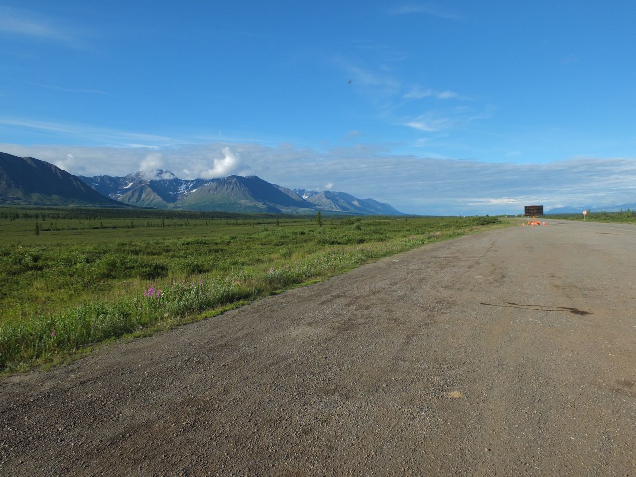 From Talkeetna, I continued to head north for several more hours. One thing that any traveler in Alaska will soon note is the amount of roadwork taking place. The freezing climate takes a brutal toll on the roads, and the summer months are the only time of the year when repairs can take place outside of true emergencies. As a result, the roads are constantly being repaved or resurfaced, which can lead to long delays even on the sparsely populated highways. I also should use the term "highways" loosely; this was Highway 3, the main road between Anchorage and Fairbanks, and yet as the pictures illustrate it was a one-lane road in each directon. The route twisted and turned its way through the mountains while seemingly endless forests of short, tough trees and open meadows passed by on each side. Lakes carved out by glaciers in the recent past dotted the landscape like blue sapphires. Unlike the past two days, the weather today was clear and sunny, with a beautiful sky spotted with puffy white clouds. It was perfect weather for a day spent outside.