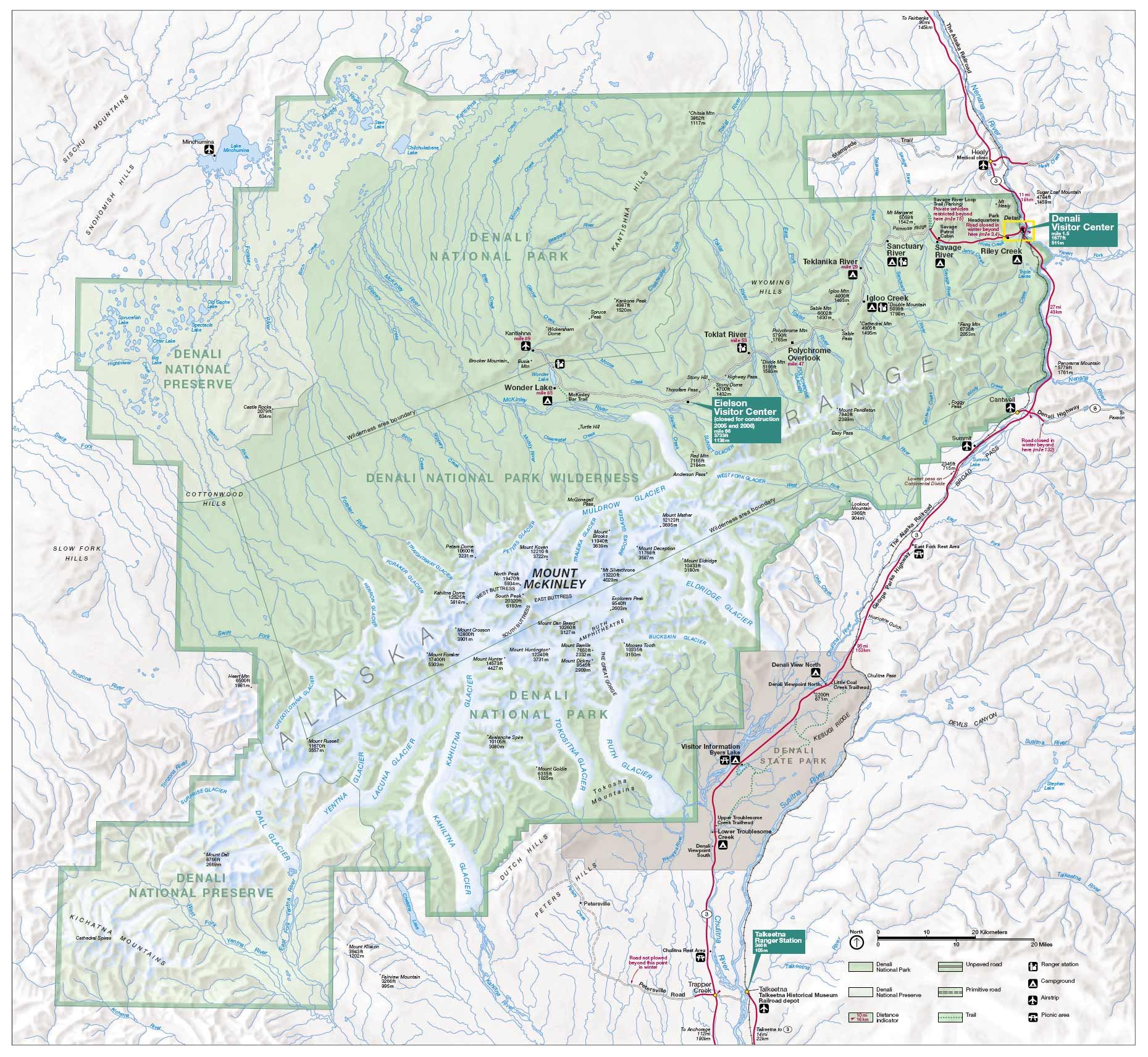 I've included one of the park maps above to illustrate where the following pictures were taken. I would be traveling to Wonder Lake, 85 miles along the Park Road, where I would be camping for the night. (The need to bring a tent along with me was the heaviest thing weighing down my luggage, although most of the time I was able to keep it in my rental car.) Anyone interested in replicating my journey should be ready to plan ahead though: reservations to camp at Wonder Lake are strictly limited. I had planned this out months in advance and made my reservation in February for this trip taking place at the end of June, and on a Sunday night to boot. Denali doesn't allow anyone to spend the night in the park unless it's been cleared ahead of time. They are highly protective of the wilderness within the park's boundaries.