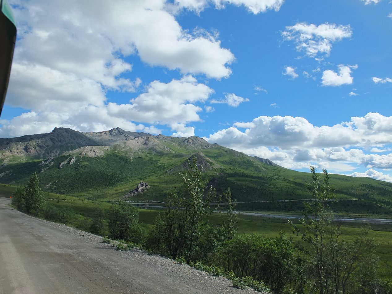 The park delivered up amazing views the whole time that we traveled, of course, and that made the slow journey a true pleasure. We quickly left behind the small area of the park open to private vehicles, and began snaking our way around one curve after another. Small rivers and streams dotted the landscape everywhere, and here in the heart of summer, the terrain was blooming with green growth everywhere. After about an hour our bus reached Sanctuary River, the first stopping point with bathrooms and a small campground. The last two pictures above are from that rest stop, where everyone dutifully poured off the bus to breathe in the fresh air. The Sanctuary River itself looked to have almost dried up, which was common for all of the other rivers in the park as well. The carved out floodplains surrounding the current trickle of water spoke to what the area must look like in the springtime though, when melting snowfall turns these placid streams into roaring torrents. There are a lot of signs in Denali cautioning visitors not to try fording the rivers, as they can be unpredictable and dangerous. But as a veteran of Oregon Trail, I knew all about what happens when trying to ford through rivers.