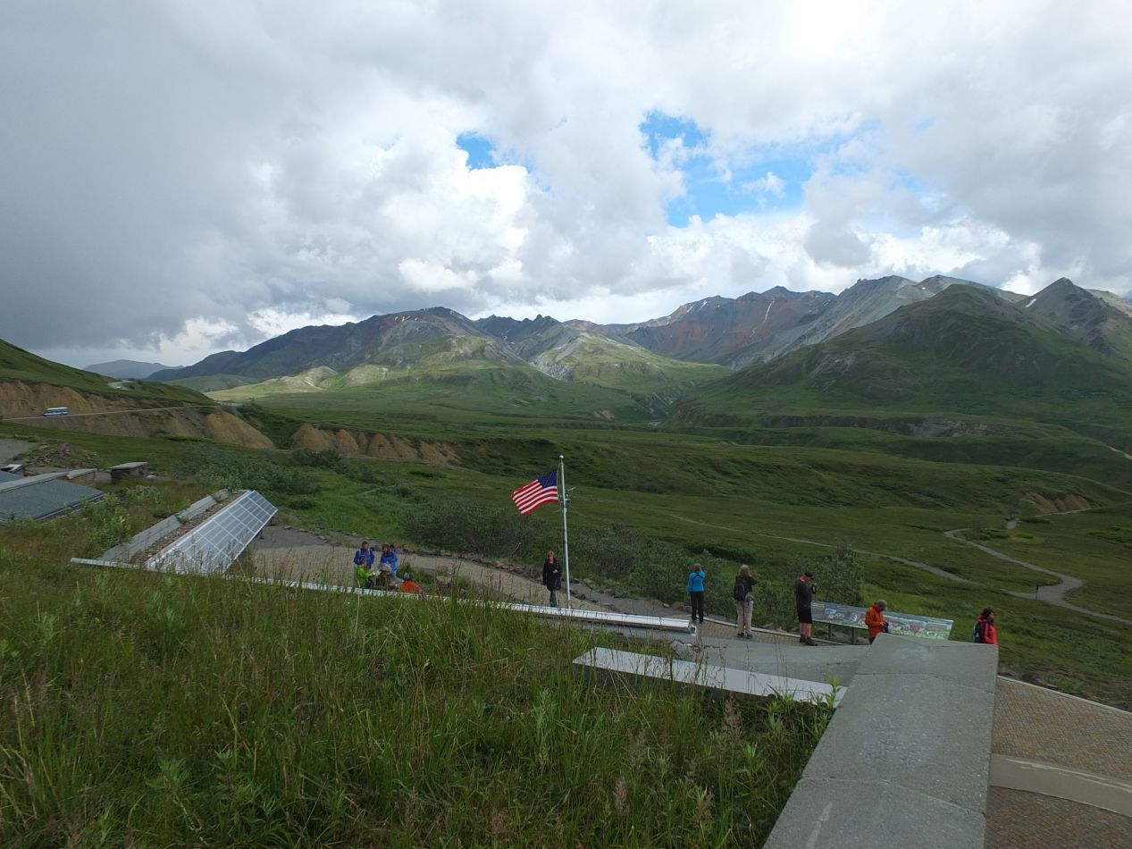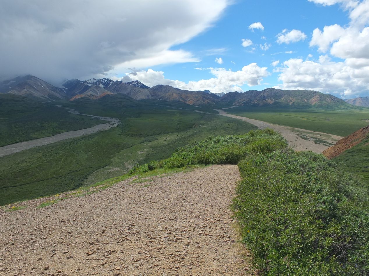 As we continued onwards, more clouds began to roll in and block out parts of the sky above. We stopped next at Polychrome Pass, 47 miles along the Park Road, which was located up on top of a ridge looking down at the surrounding plains. To the southeast from the direction we had come, the sky remained bright and sunny with occasional puffy white clouds. Off to the southwest, however, there was a dark patch of clouds shrouding the mountains in dense fog. The landscape was open enough that we could see the weather patterns moving across the sky, with the mountains influencing what took place in the skies above. The contrast between light and darkness was particularly stark here, and with a storm front coming through I could feel the barometric pressure dropping. We were back on the bus before the rain hit though, and fortunately this patch of bad weather blew itself out pretty quickly instead of sticking around for the rest of the day.