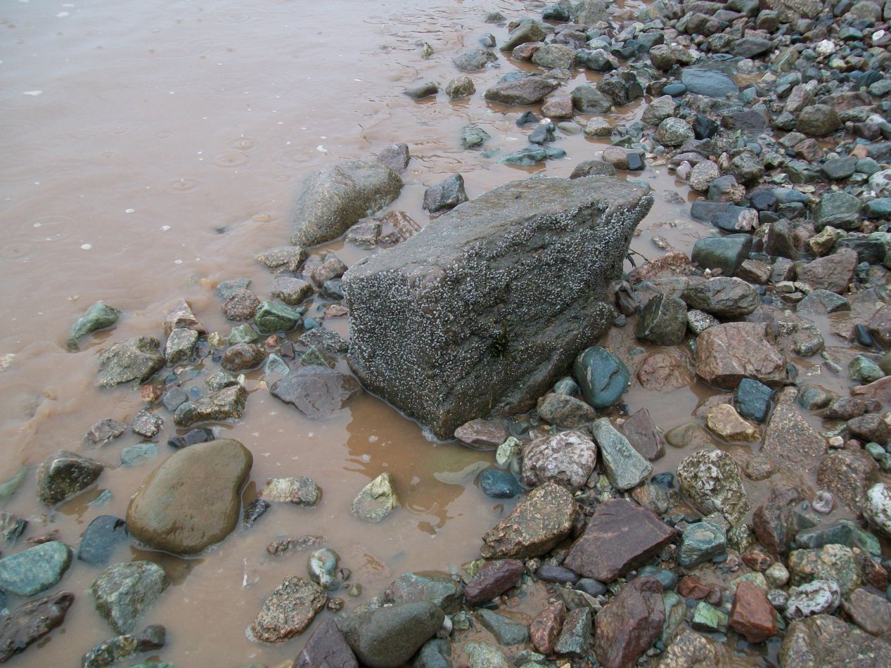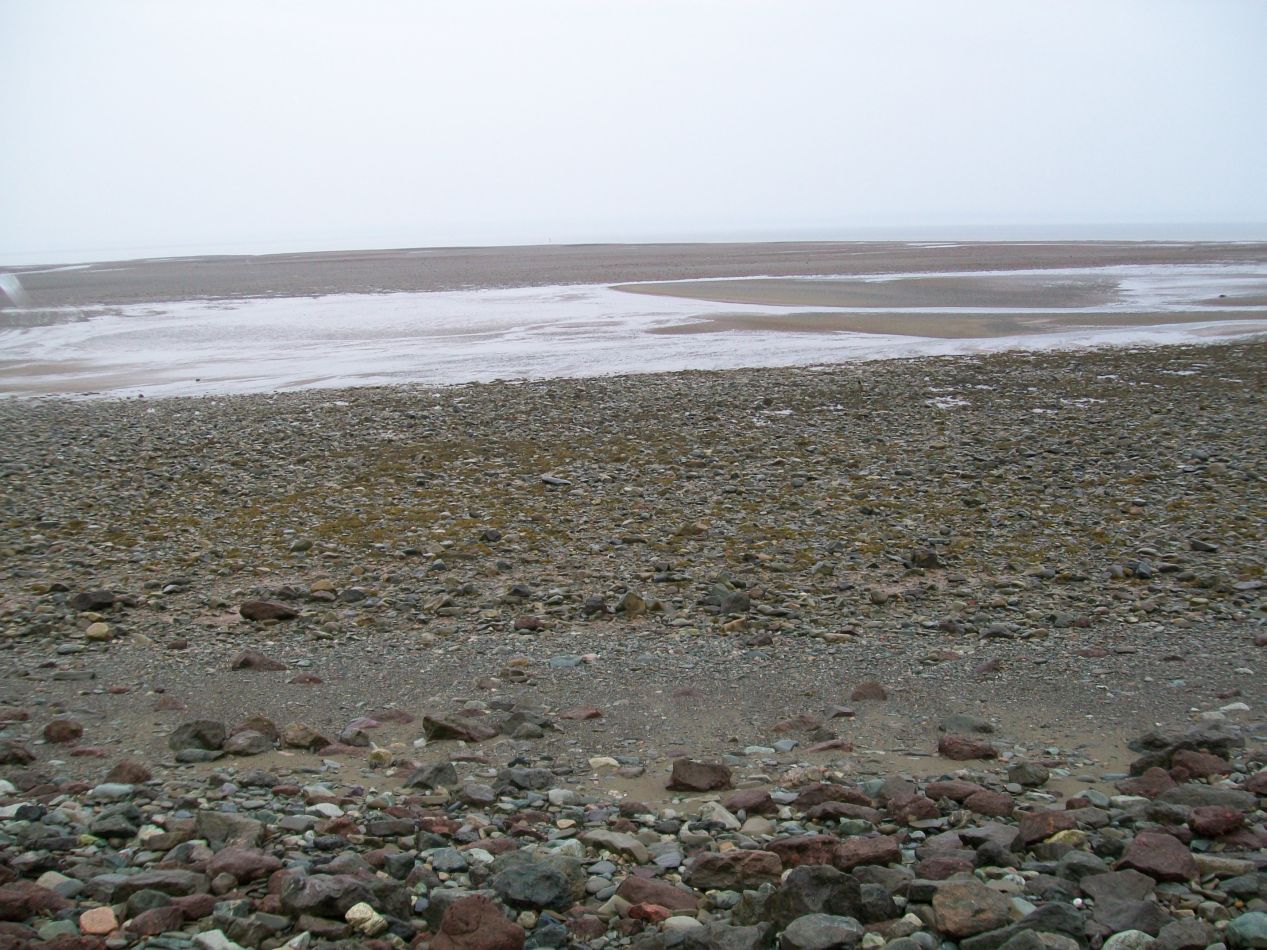 These pictures were taken at the beach outside Alma, the tiny little hamlet at the edge of Fundy National Park. I imagine that this is a beautiful place on a sunny summer day, but it was rather dreary with the poor weather that I was experiencing here. I reached Alma pretty much exactly at low tide, and the resulting sight was a long expanse of mud flats stretching off into the distance. The water was at least a full football field's length away if not further. I experienced that same result as I drove further up the coast to the east, with long exposed sandbars everywhere. I ended up getting lost a bit on this drive, as my dashboard navigation system (back in the pre-Google Maps days) didn't seem to know quite where we were located. It actually sent me on a dirt road that dead ended into a farmer's field at one point! I had to do the low tech thing and turn it off, navigating by a foldout paper map instead. I was helped by the fact that there was pretty much only one road to take in this rural area, and as soon as I ignored the navigation system and took that road, things worked out just fine.