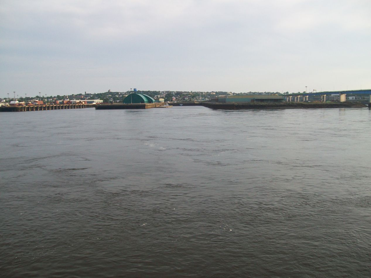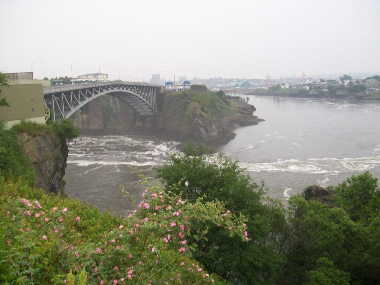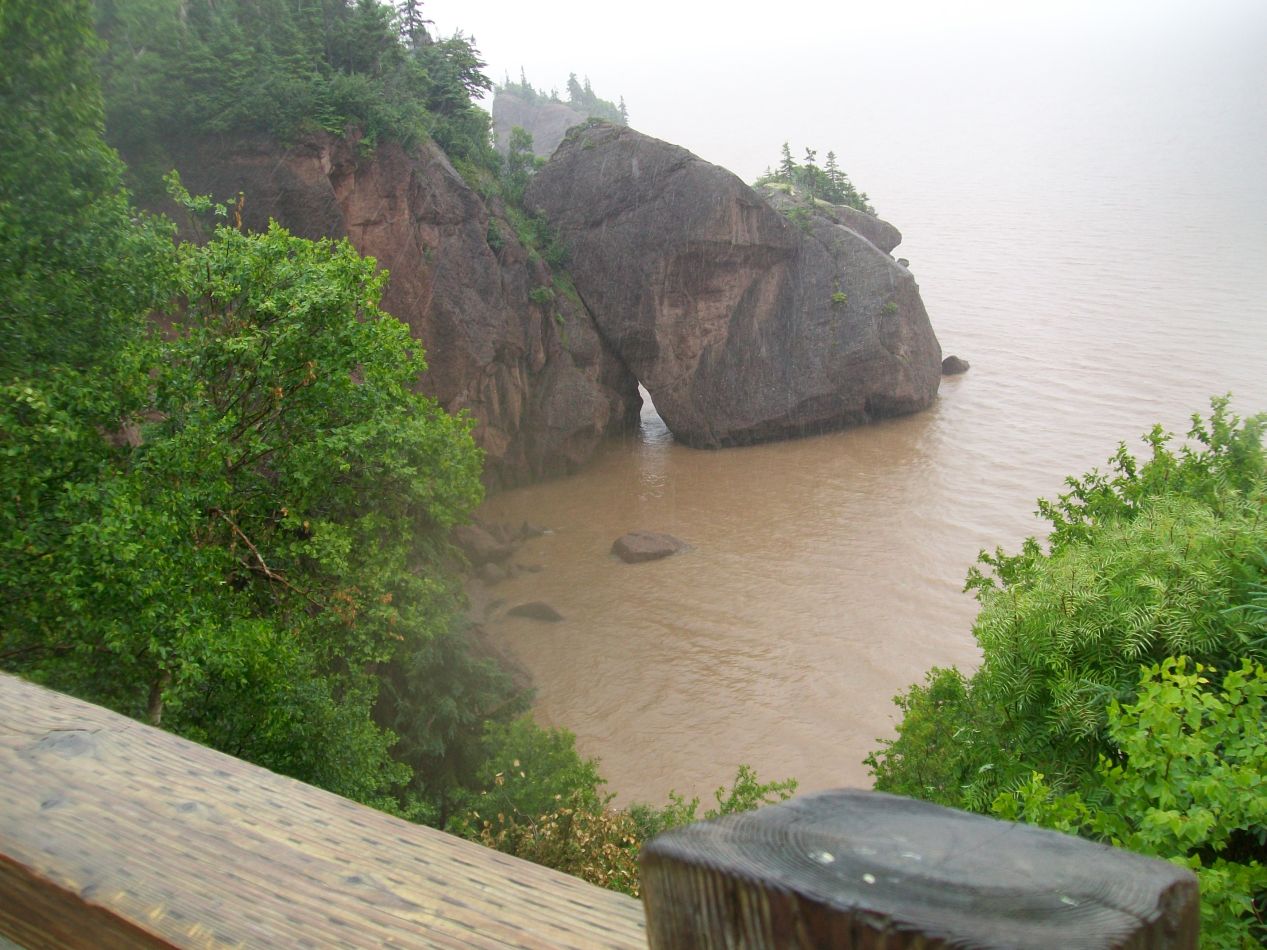 I spent the night in a mostly deserted hostel and woke up early again the next morning. My goal for the day was to visit some of the sights along the Bay of Fundy and to experience the dramatic tidal shifts for myself. I had looked up the tides the night before and spotted that low tide would take place around 8:30 AM while high tide would occur six hours later at about 2:30 PM. By getting up early enough, I would be able to experience both of them in a single day. My first stop took place in Saint John itself at the natural phenomenon known as the "Reversing Falls". These are a series of rapids on the St. John River where the river runs through a narrow gorge before emptying into the Bay of Fundy. The tides in the bay are so strong that they force the flow of water to reverse itself against the current when the tide is high, creating the bizarre spectacle of water flowing uphill backwards up the river. Unfortunately I wouldn't be able to stick around to watch that since the times didn't line up correctly, but I was able to see the Reversing Falls themselves, formed by high cliffs overlooking a narrow canyon of water. There was a steady rain falling and the waters below were churned up into white froth by their passage though the falls. There honestly wasn't too much to see here outside of the specific moment each day when the falls reverse their flow, and that led to one publication dubbing this to be among the worst tourist attractions in the world.